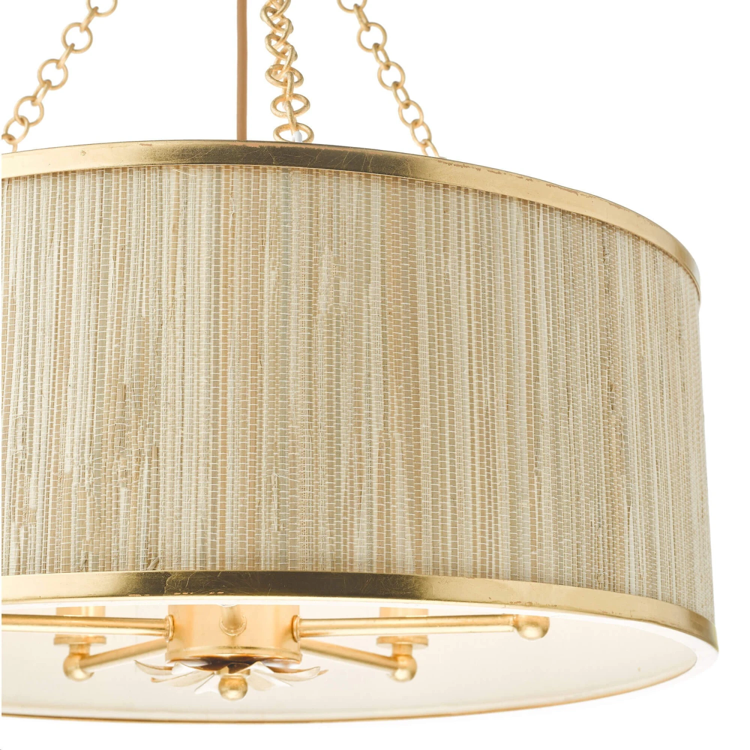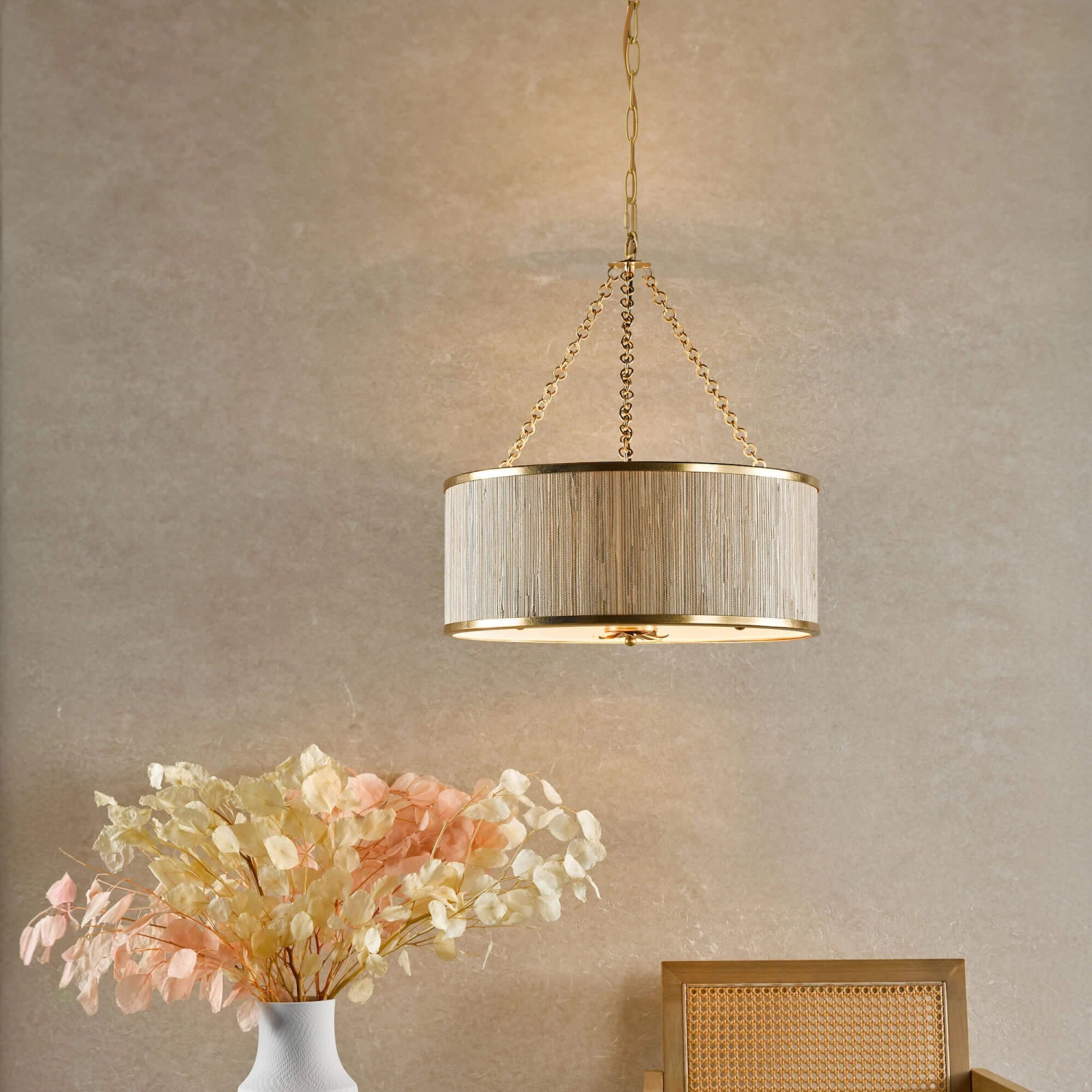 Add an opulent and luxurious touch to your home with this Fenella Gold & Seagrass 5 Light Pendant. Illuminable by five E14 LED bulbs, this elegant pendant light features a natural seagrass linen lined shade in a contemporary drum shape with a beautiful five arm fixture finished with gold leaf rims and chain, diffusing a soft light to create a warm and cosy ambience. Adjustable in height from 50cm to 180cm, this stunning pendant light is perfect for adding organic style and sophistication to any room, making it able to elevate the overall aesthetic of your décor, whether it is placed in the hallway or above the dining table, it is sure to make a statement.
