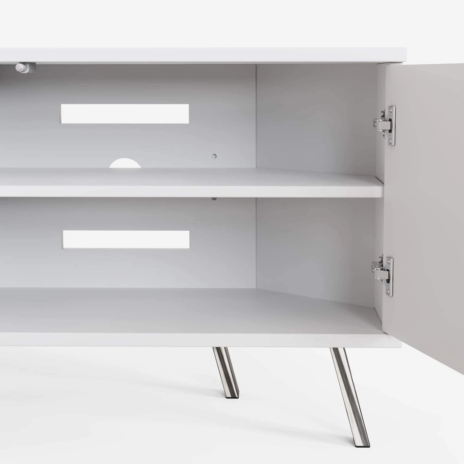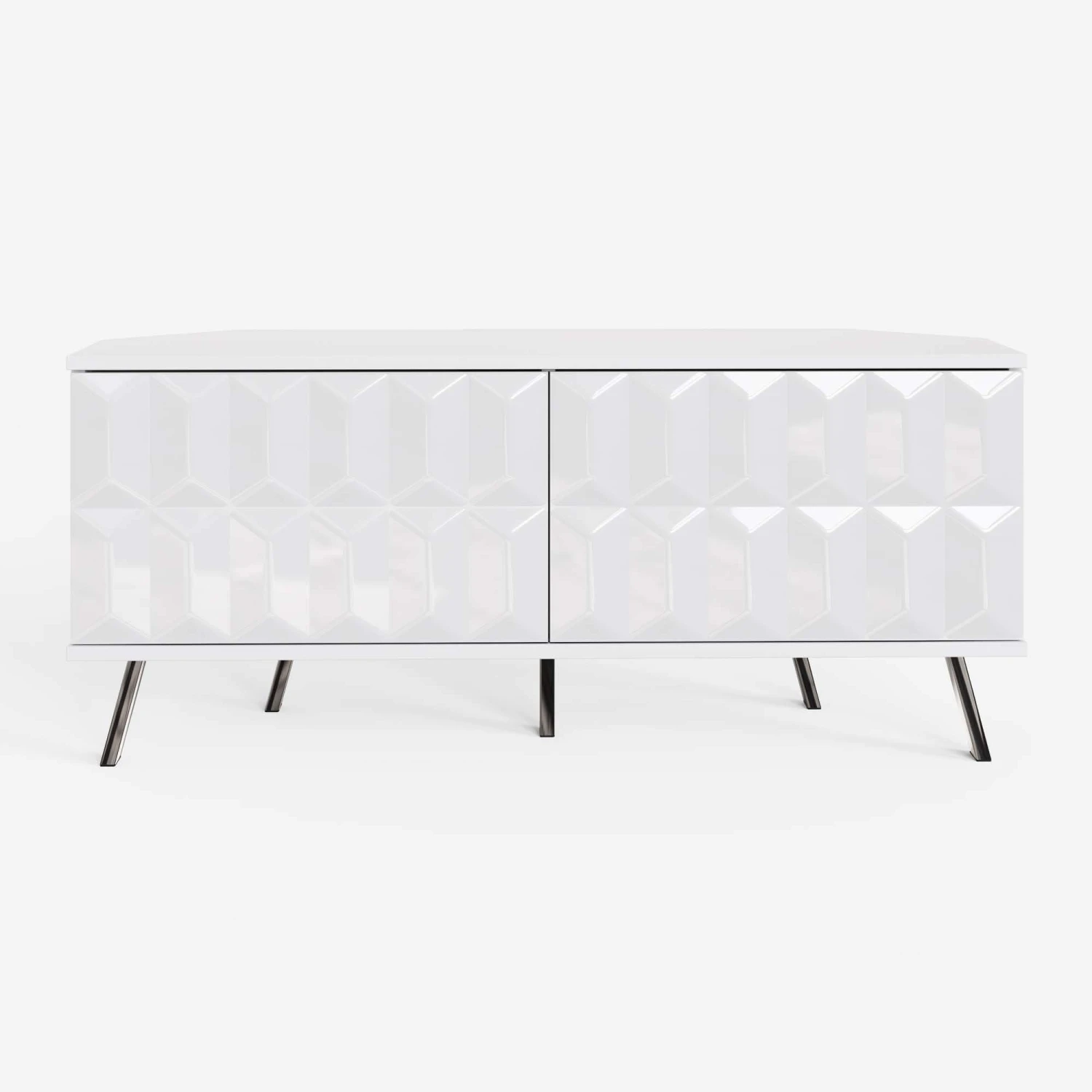 The Elevate White Corner TV Unit features a bold look, with a high-shine painted, textured geometric doors and complementing satin finish to the main body, elevated by high shine smoked grey legs to complete the look. The TV Unit has intelligent eye remote control allowing up to six pieces of AV equipment to be operated with the doors closed, so you can neatly store away your TV equipment with no unsightly cables or wires on show. The TV Unit also features integrated full colour spectrum LED lighting, which can be controlled with the Frank Olsen app or by voice command with SMART speaker.