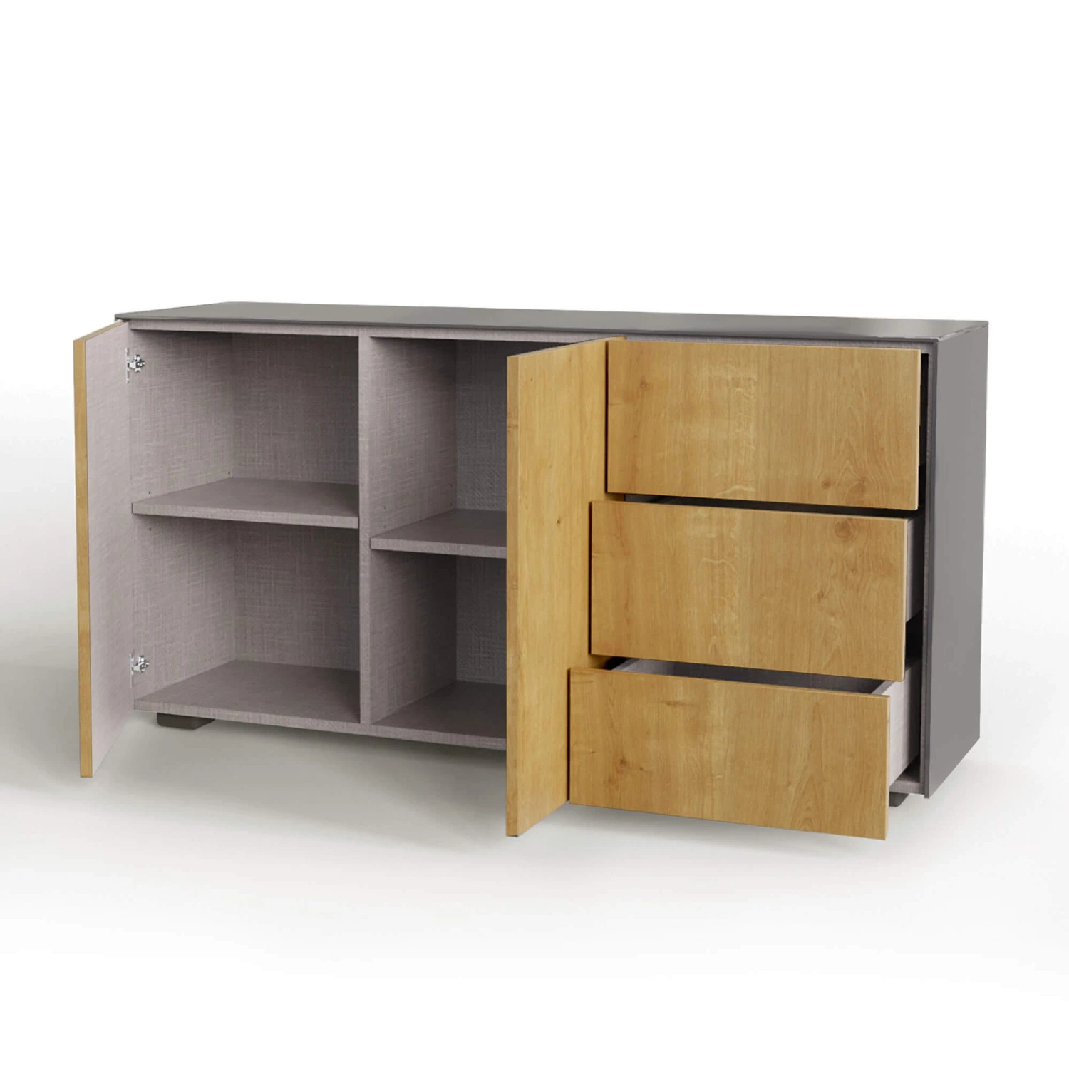 Created with style and functionality in mind, the Intelligent Sideboard boasts a scratch resistant, high gloss grey exterior, oak effect doors, glass top and a textured grey interior with adjustable internal shelves. The combination of an ultra-chic design and superb technology makes this a must-have piece of furniture for any modern home.