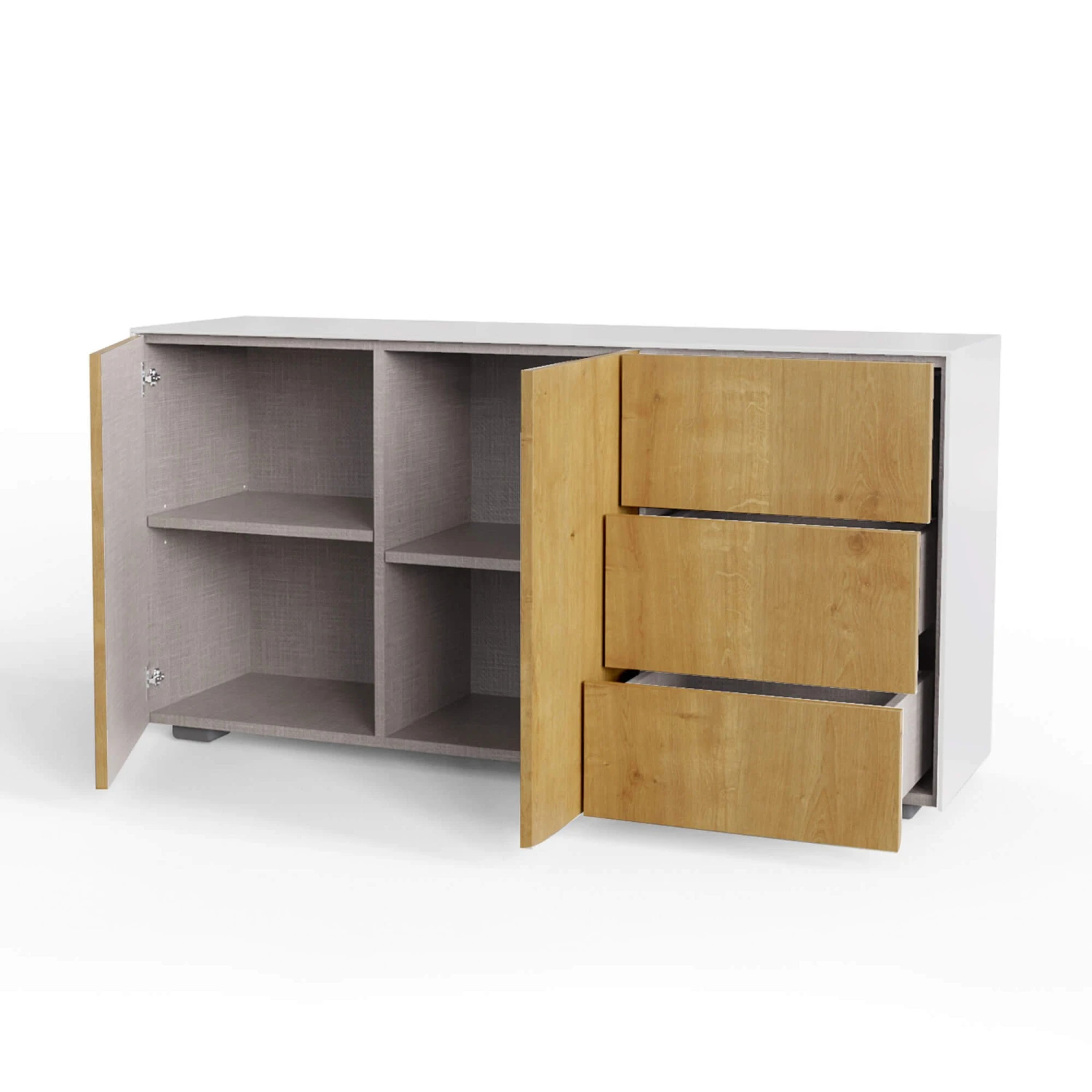 Created with style and functionality in mind, the Intelligent Sideboard boasts a scratch resistant, high gloss white exterior, oak effect doors, glass top and a textured grey interior with adjustable internal shelves. The combination of an ultra-chic design and superb technology makes this a must-have piece of furniture for any modern home.