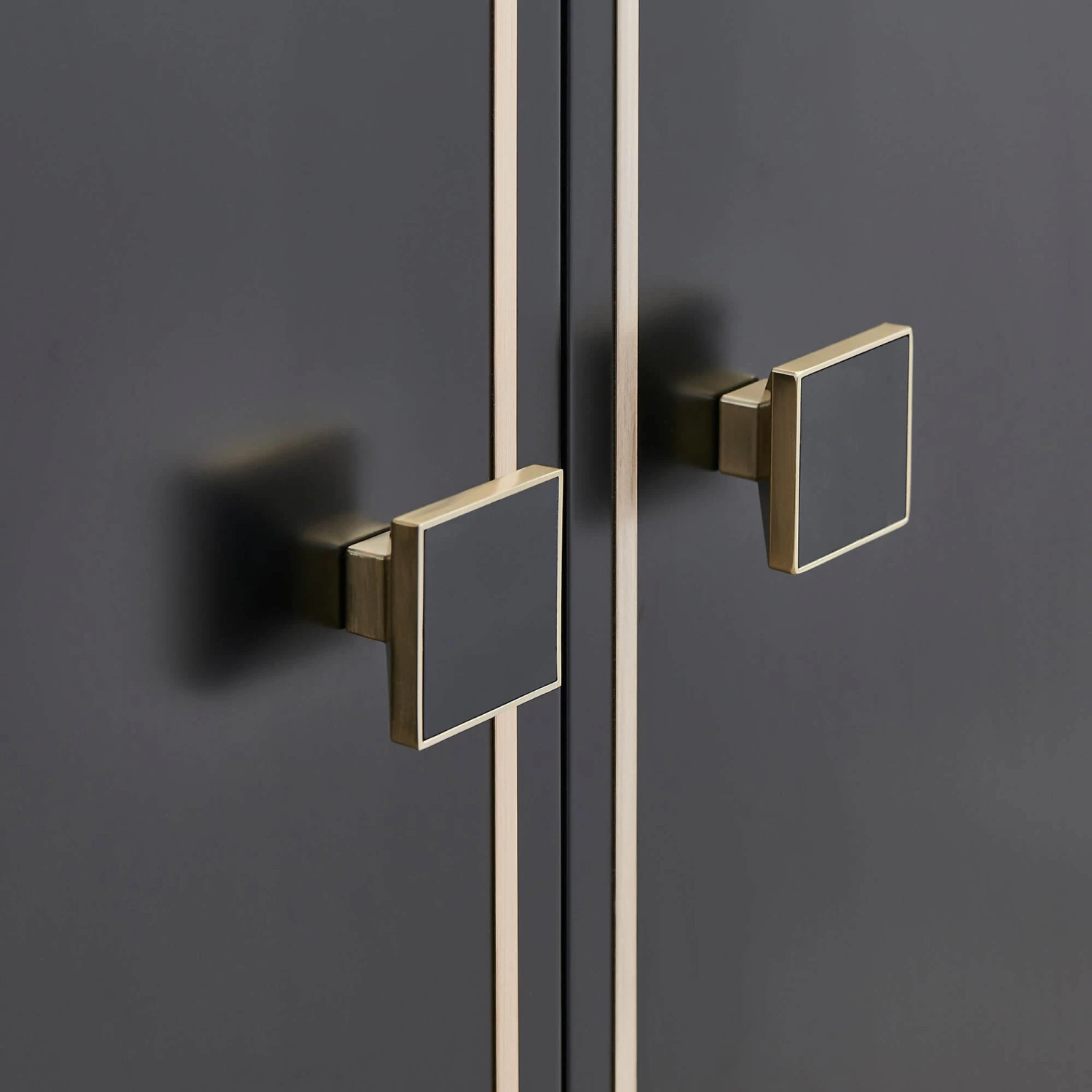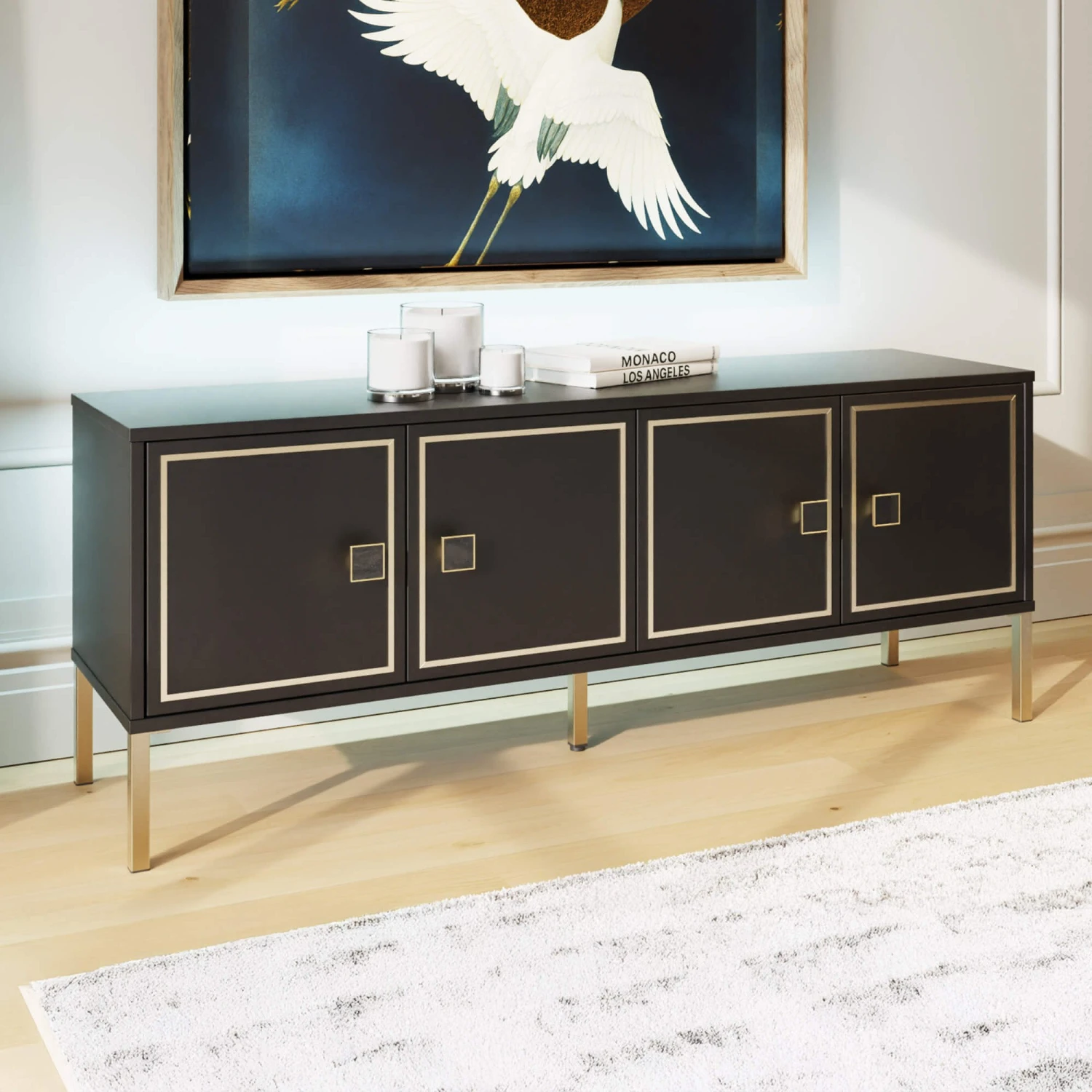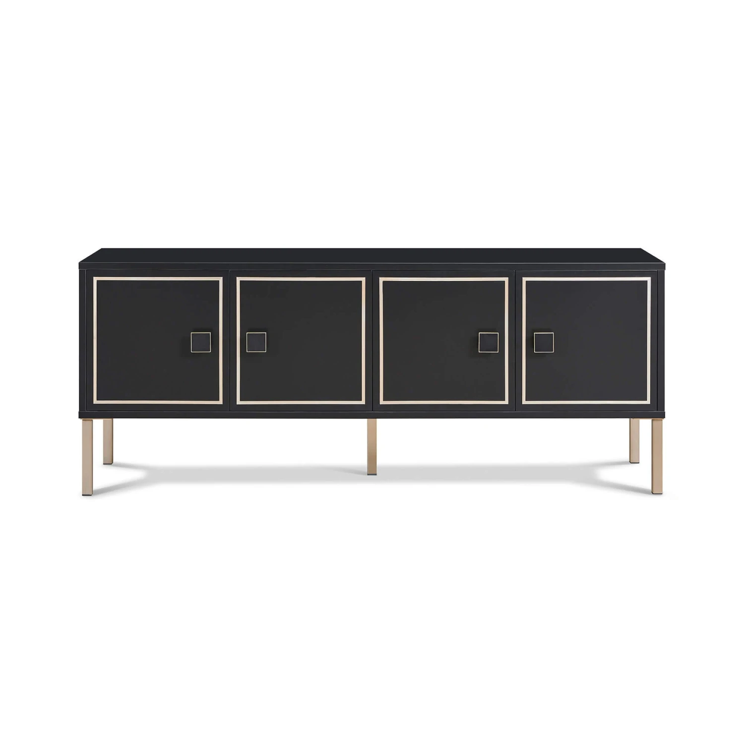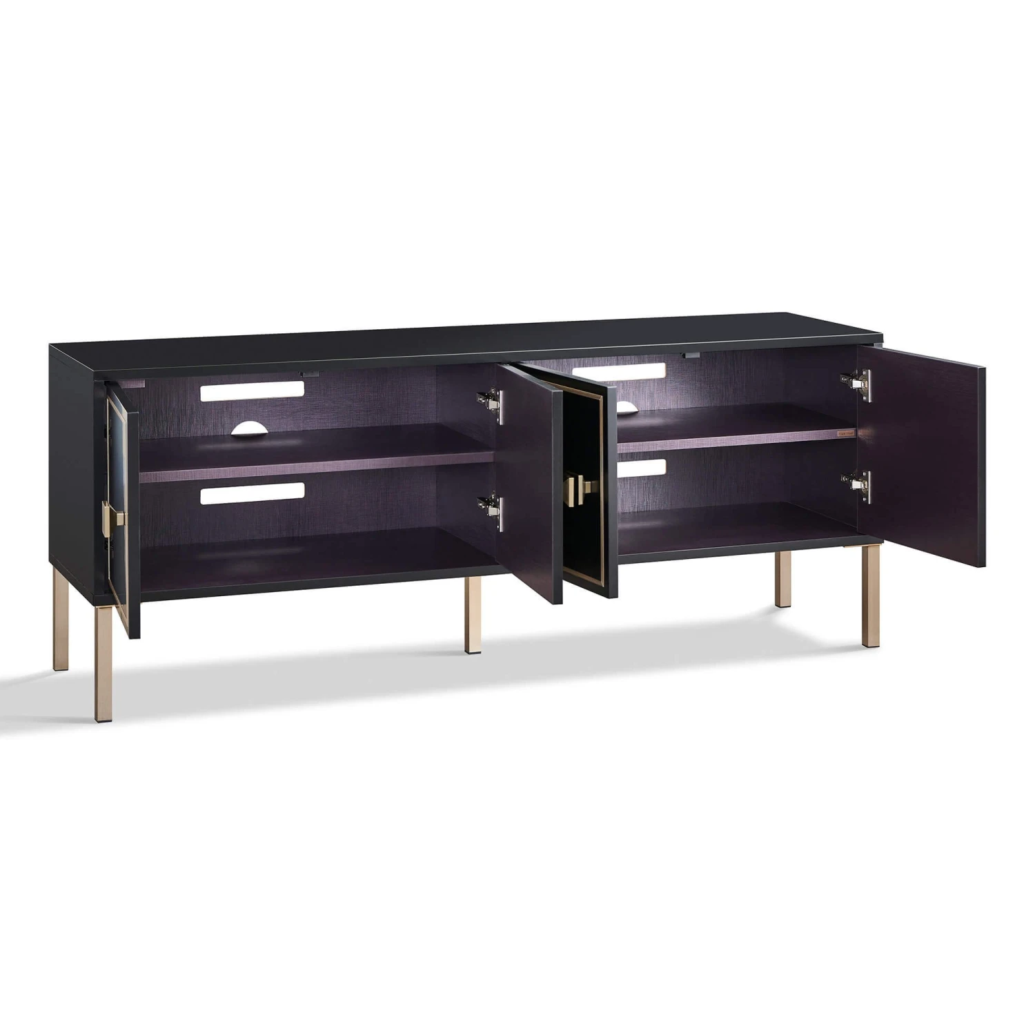 The Frank Olsen Mia Large Black TV Stand is a sophisticated piece, perfect for modern interiors. The satin painted cabinet top and doors are finished in a sleek matte black, providing a striking backdrop for the inset metallic detailing. The inlay warm bronze details are a key design feature, complimented by square bronze handles which also have a matte black finish on the front. This combination of textures and finishes, along with the metallic brushed bronze touches, gives the tv stand a luxurious and contemporary feel.