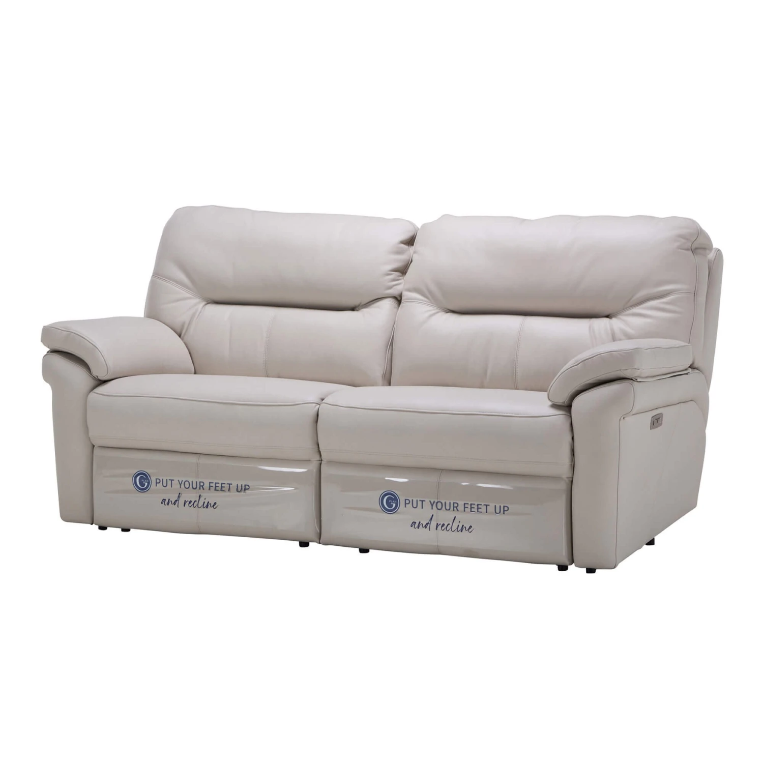 Elegant simplicity meets supreme comfort, the Seattle Capri Chalk Leather 3 Seater Double Power Recliner Sofa from G Plan is a sleek, tailored piece that has been meticulously hand-crafted from the finest materials to deliver unrivalled comfort in a crisp, clean cut design. Upholstered in a cream leather with pale grey undertones, the Seattle features defined straight lines, soft curves, crisp tailoring, sleek padded arms, full cushions and black metal feet, creating an extremely comfortable and sophisticated piece.