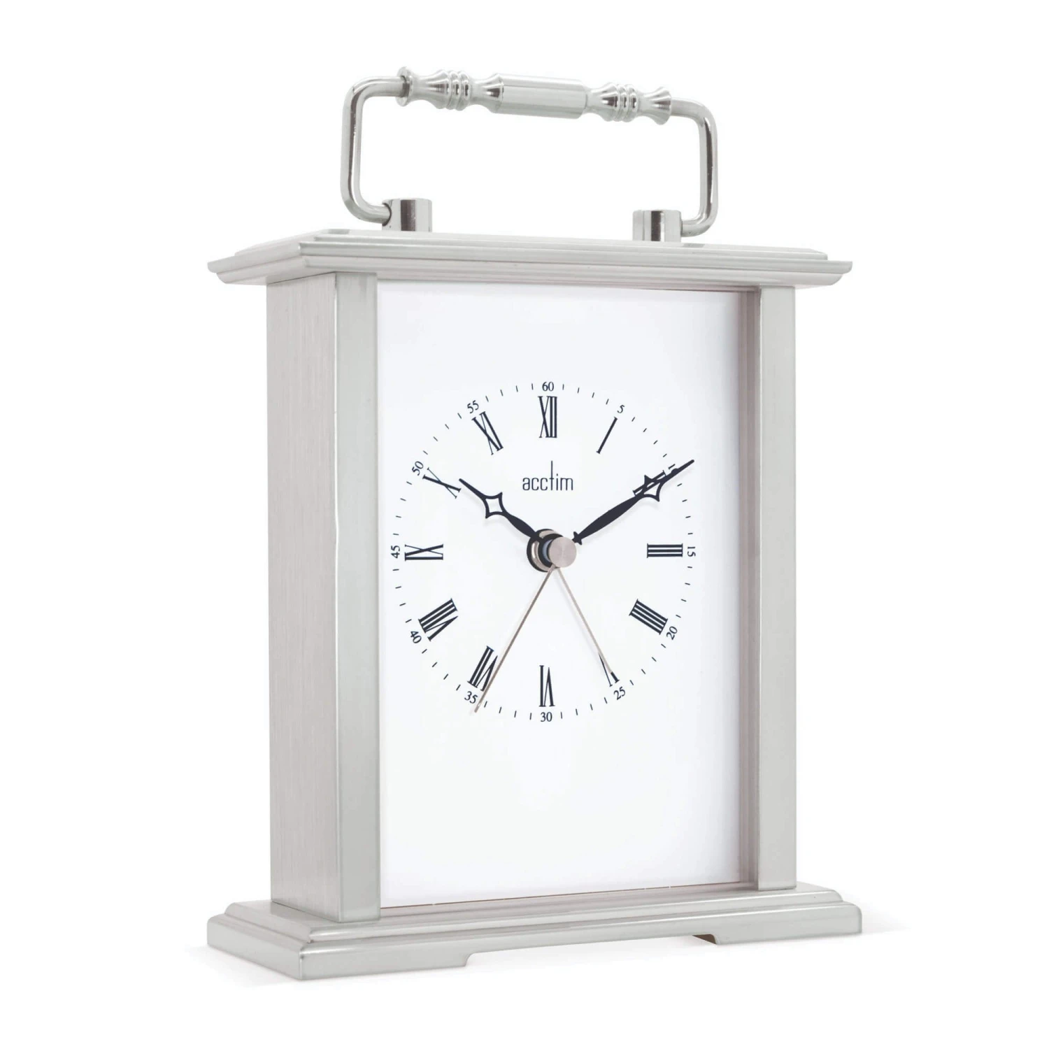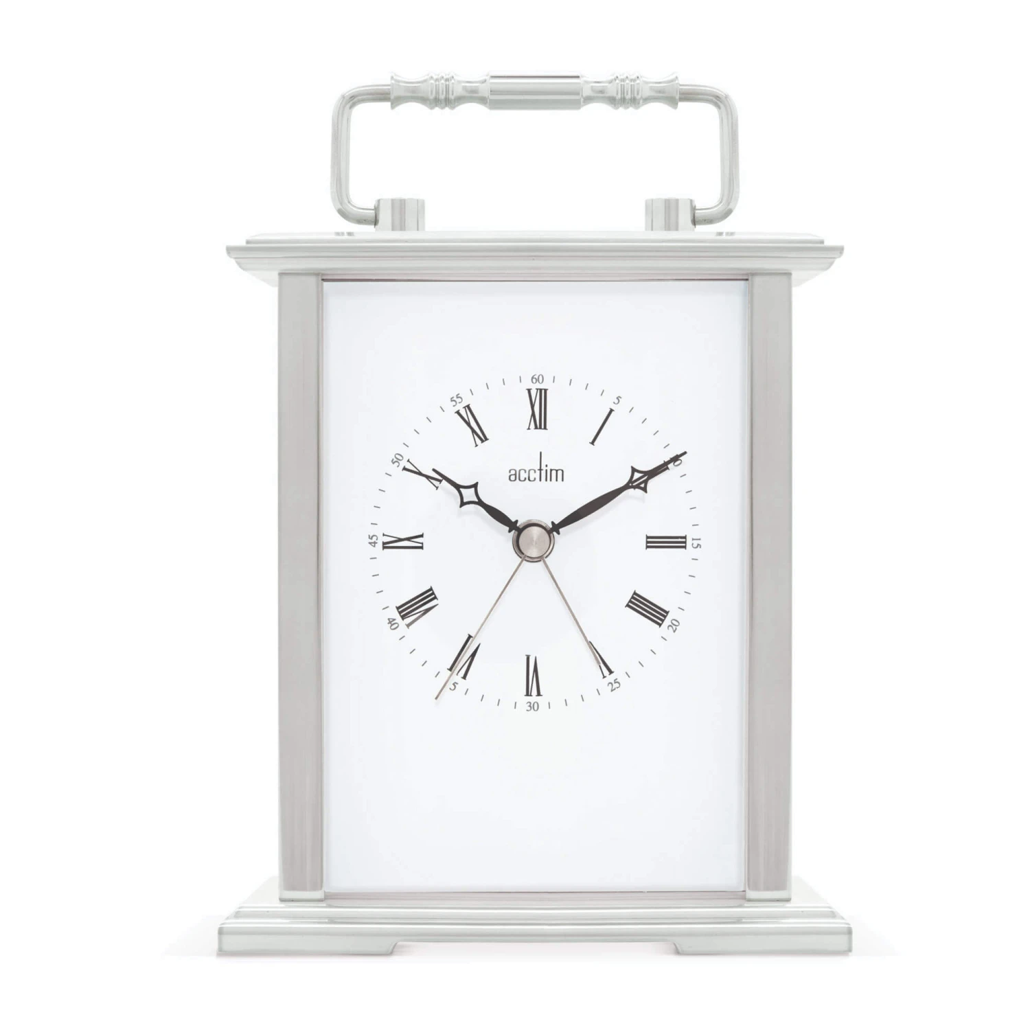 This clock is a contemporary reinterpretation of timeless 19th-century design. This exquisite timepiece effortlessly blends traditional elements with a sleek, modern sensibility, making it a perfect addition to any discerning home. The clock is housed within a tall, rectangular bevelled case, finished in a luxurious silver that exudes sophistication. A distinct handle, in a polished silver, sits elegantly atop the case, not only enhancing its classic carriage clock aesthetic but also offering a subtle nod to its portable heritage.