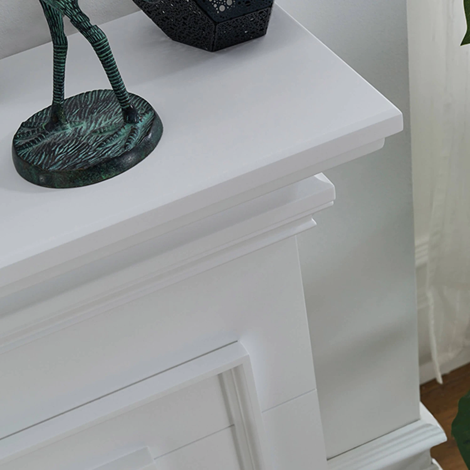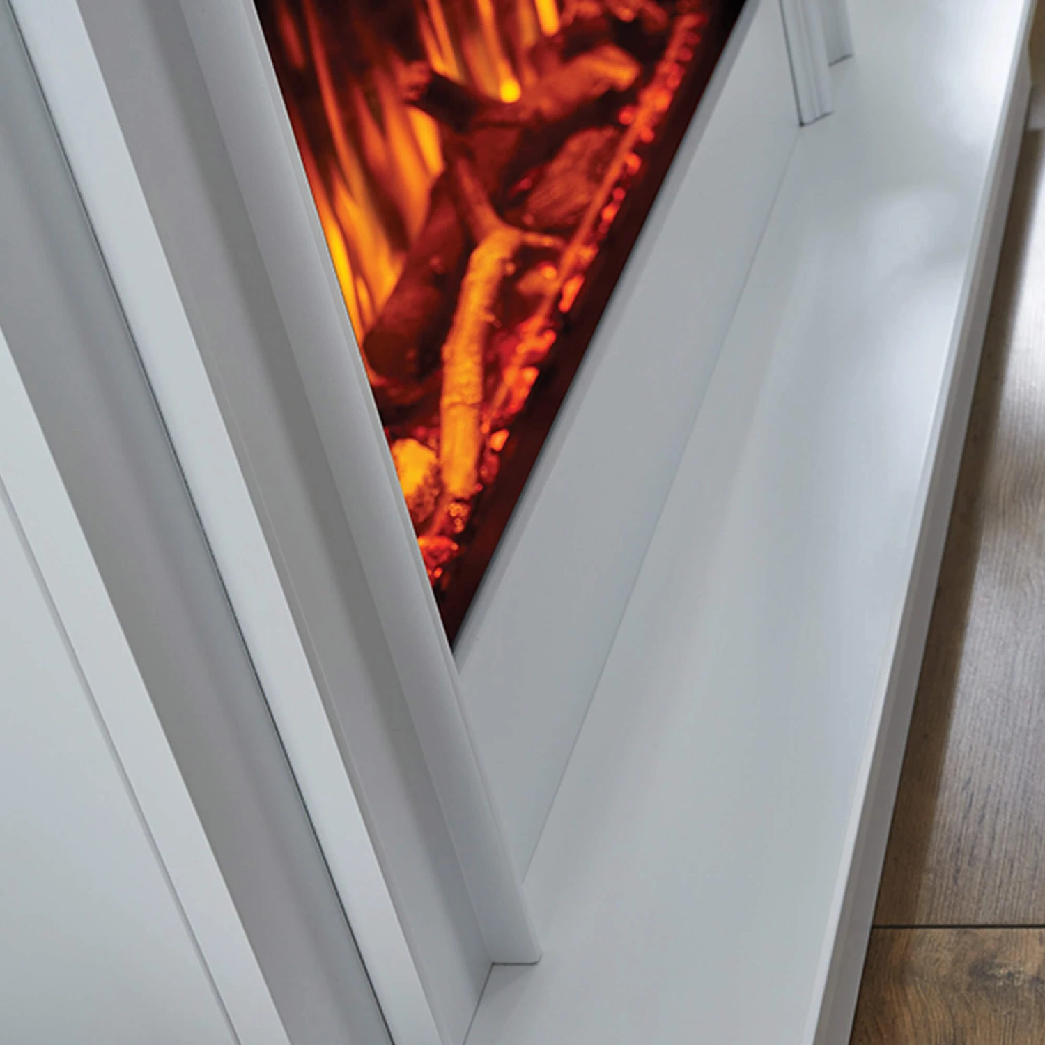 The elegant electric fireplace suite presents a pristine, crisp white surround, meticulously designed with straight, upright legs that ensure a solid and symmetrical appearance. Subtle moulding details, thoughtfully placed beneath the mantel and along the inner edge of the uprights, introduce a touch of architectural finesse to its clean lines. This well-defined surround frames the large picture frame fire, allowing it to take centre stage. The heath, a practical and prominent feature, projects outwards from the main body, providing a clear visual foundation and a functional ledge. This transitional suite style seamlessly blends classic elements with a contemporary, clean finish, making it a versatile addition to any home.