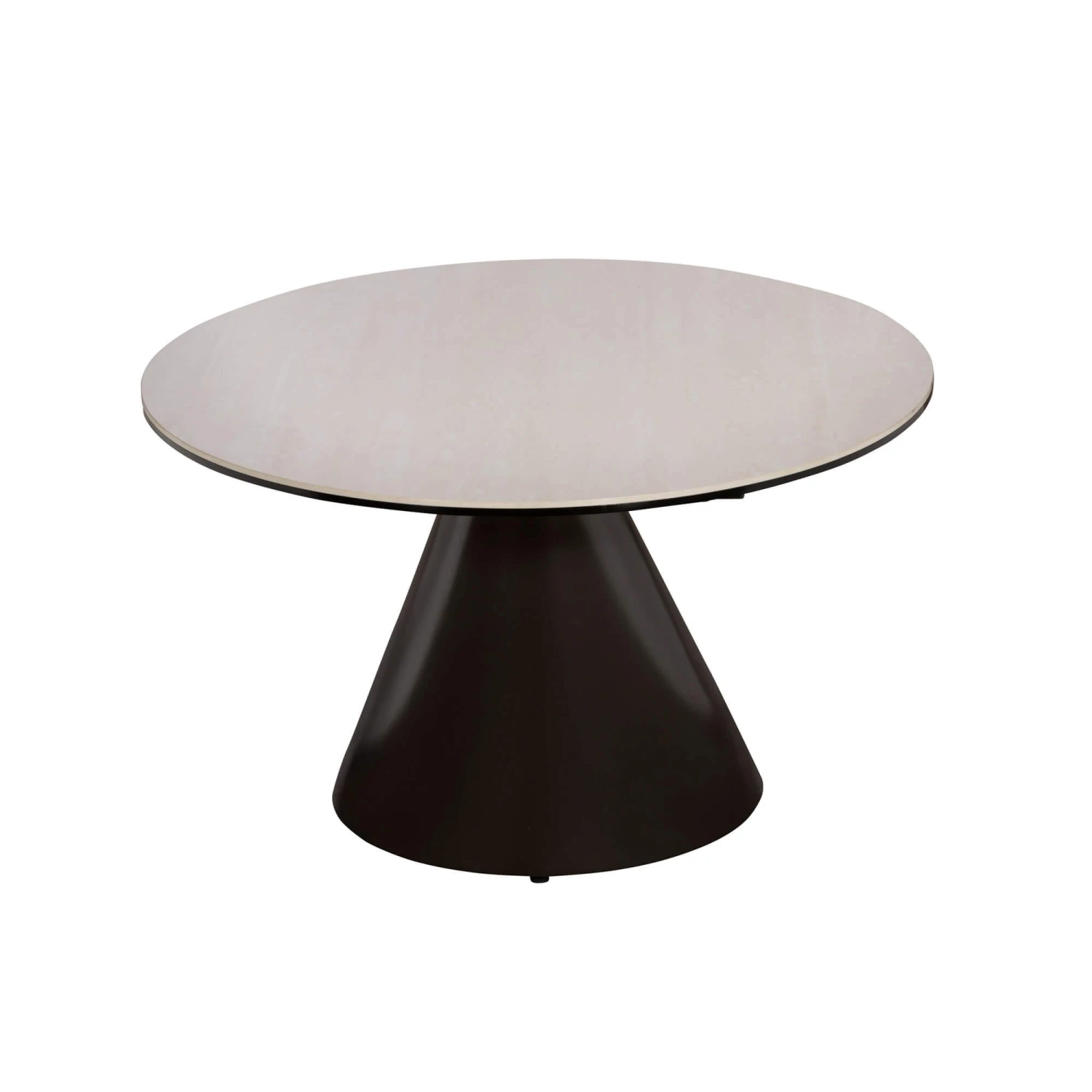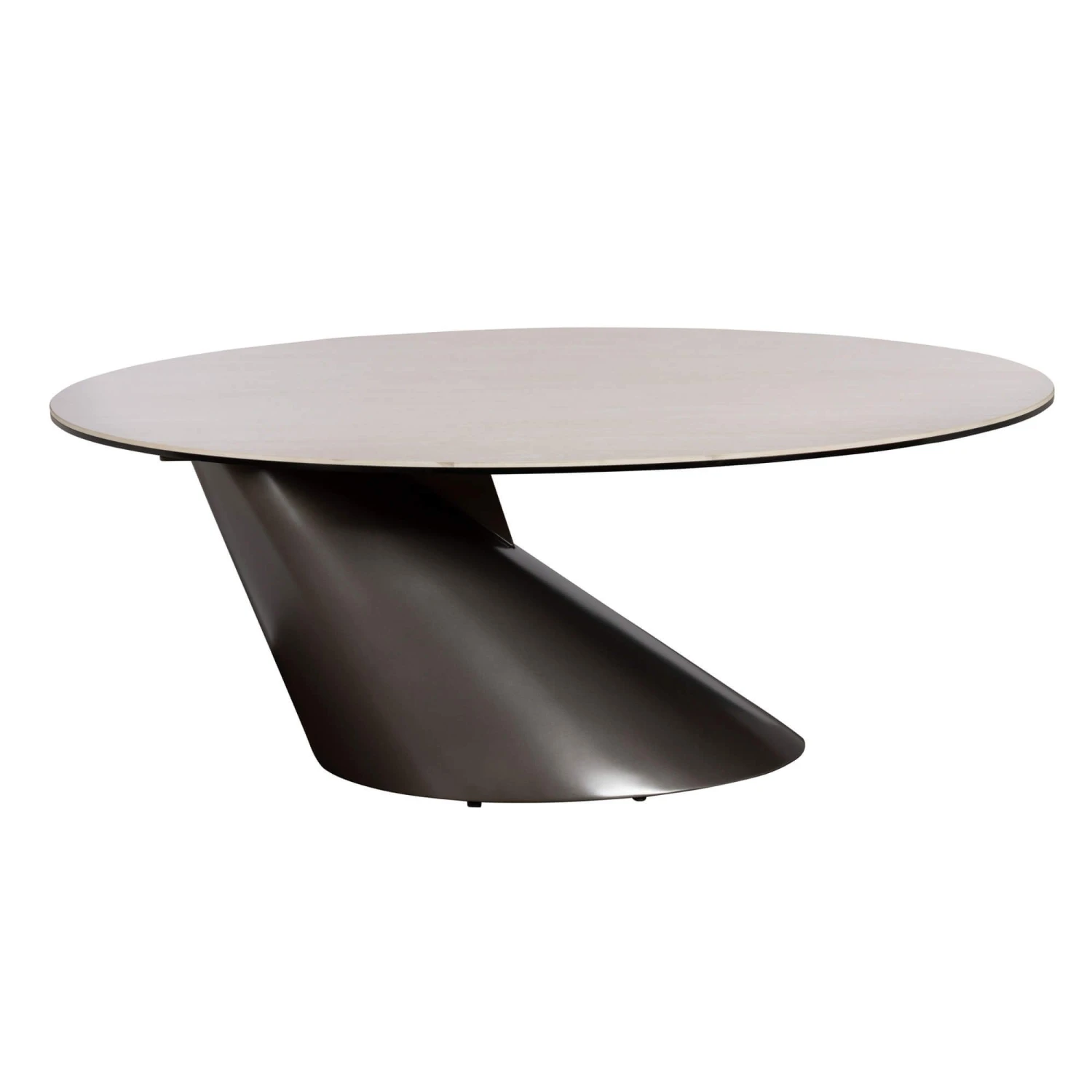 A contemporary ceramic coffee table that embodies luxury and modern design. The table features a striking sloped cylindrical base in a sophisticated bronze finish, artfully narrowing towards the top to create a sense of visual balance and elegance. Its organic silhouette is complemented by a glass-coated white ceramic top, thoughtfully offset against the base to create a dynamic and sculptural presence.