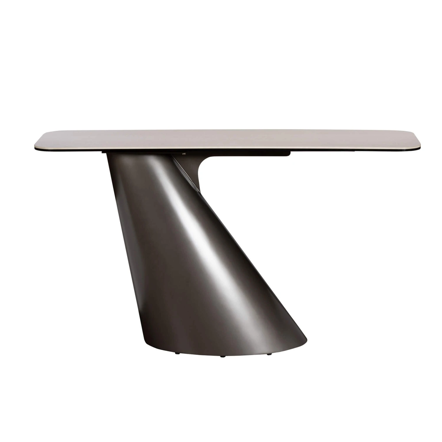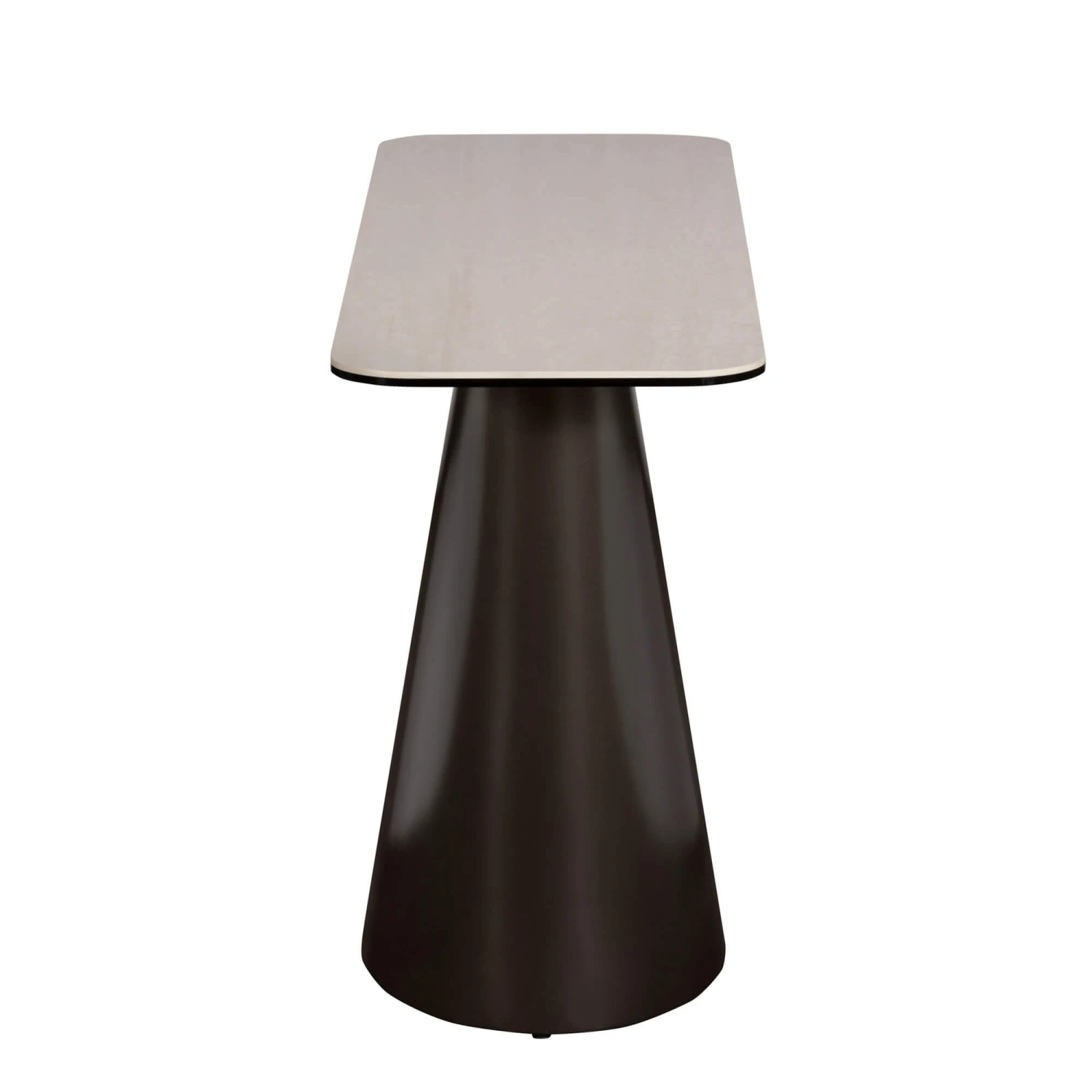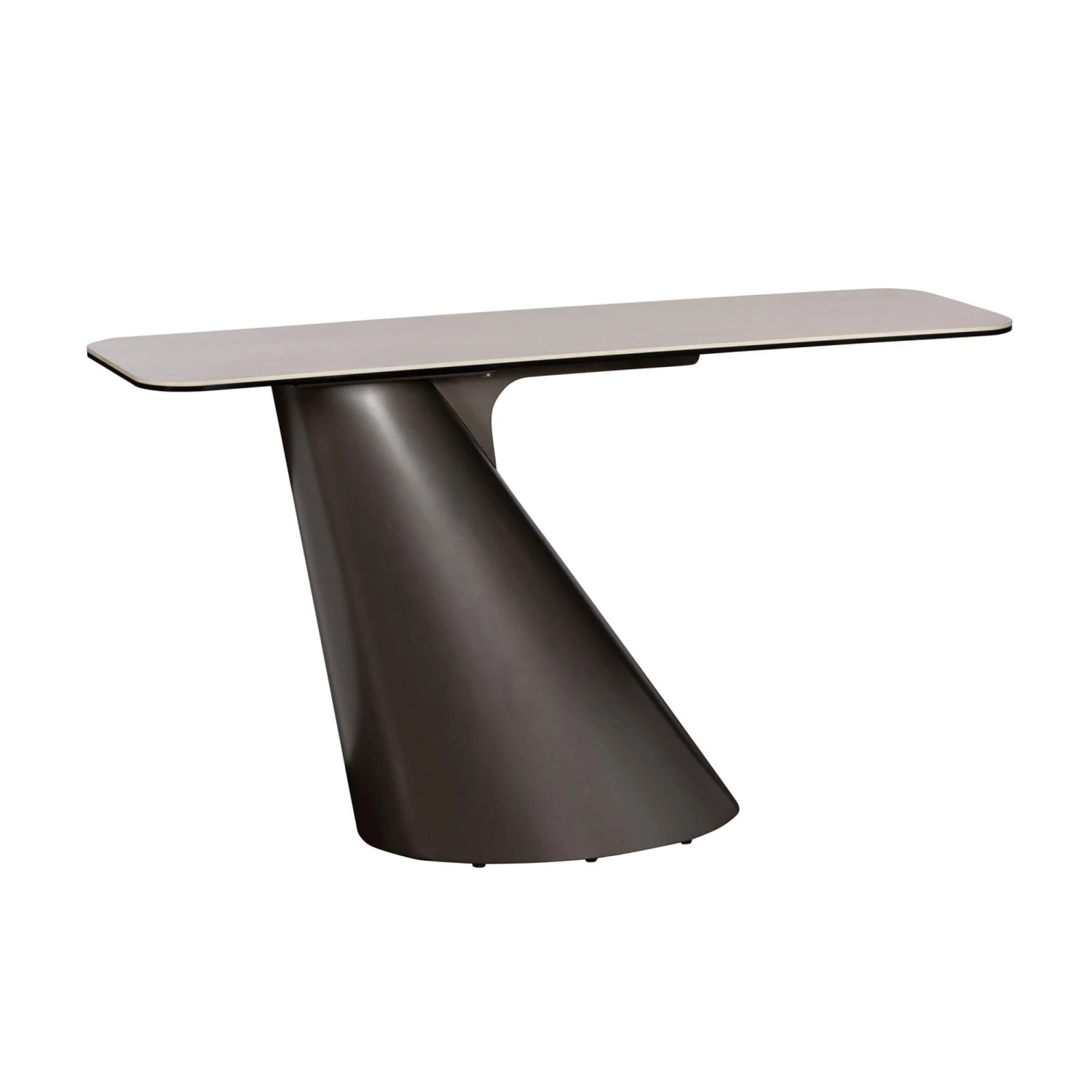 A contemporary ceramic console table that embodies luxury and modern design. The table features a striking sloped cylindrical base in a sophisticated bronze finish, artfully narrowing towards the top to create a sense of visual balance and elegance. Its organic silhouette is complemented by a glass-coated white ceramic top, thoughtfully offset against the base to create a dynamic and sculptural presence.