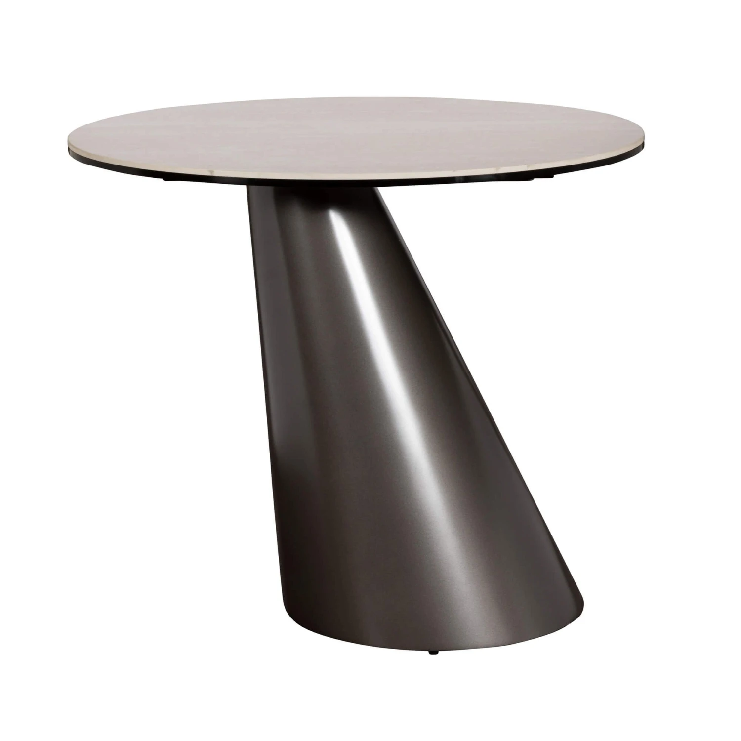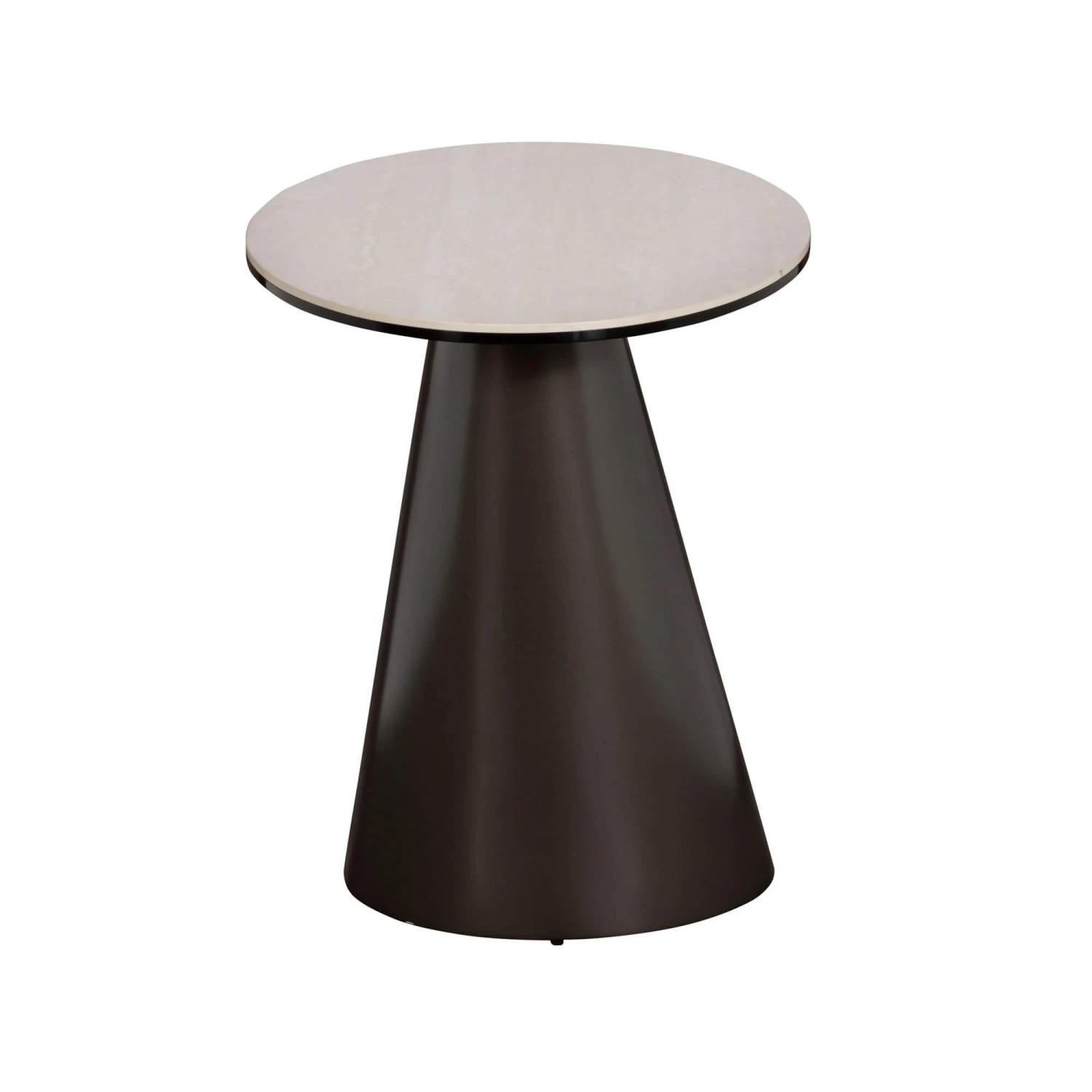 A contemporary ceramic lamp table that embodies luxury and modern design. The table features a striking sloped cylindrical base in a sophisticated bronze finish, artfully narrowing towards the top to create a sense of visual balance and elegance. Its organic silhouette is complemented by a glass-coated white ceramic top, thoughtfully offset against the base to create a dynamic and sculptural presence.