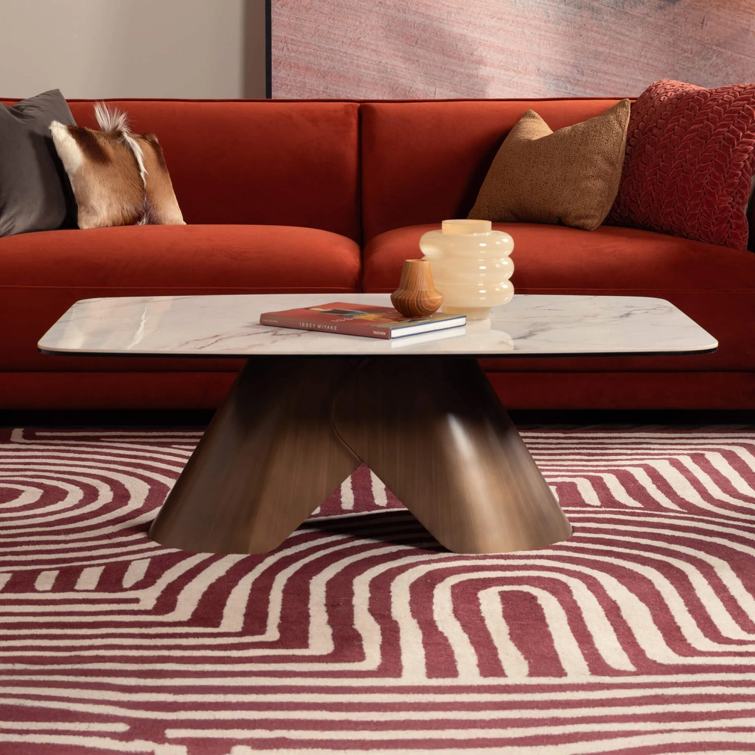 Beneath, the table’s architectural base makes a bold statement with overlapping, arching legs in a rich bronze-coloured finish. The twin flared supports form an open, sculptural shape, enhanced by a vertical brushed texture that catches the light beautifully. This distinctive design balances contemporary style with a sense of grounded elegance, making it an ideal centrepiece for any luxury living space seeking both visual intrigue and timeless appeal.