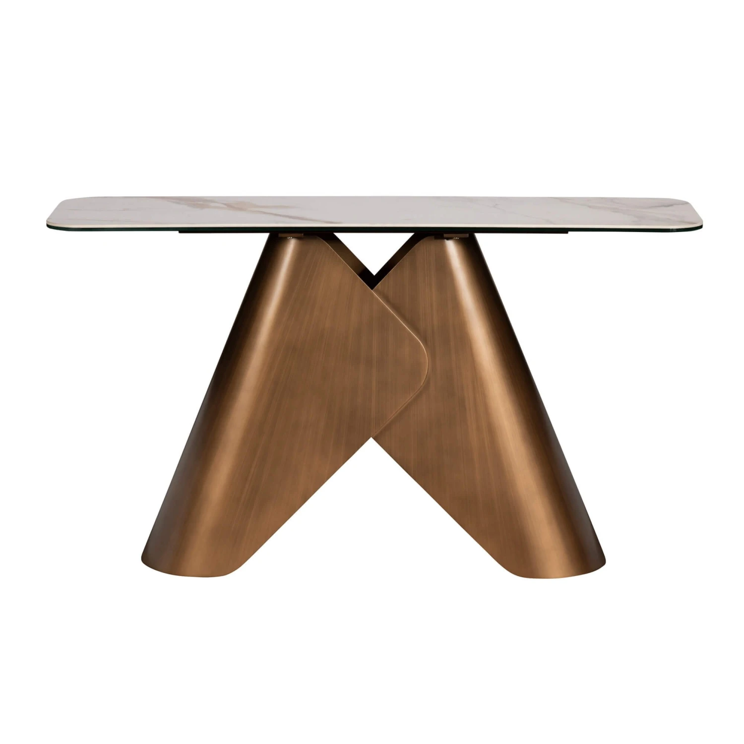 Beneath, the table’s architectural base makes a bold statement with overlapping, arching legs in a rich bronze-coloured finish. The twin flared supports form an open, sculptural shape, enhanced by a vertical brushed texture that catches the light beautifully. This distinctive design balances contemporary style with a sense of grounded elegance, making it an ideal centrepiece for any luxury living space seeking both visual intrigue and timeless appeal.