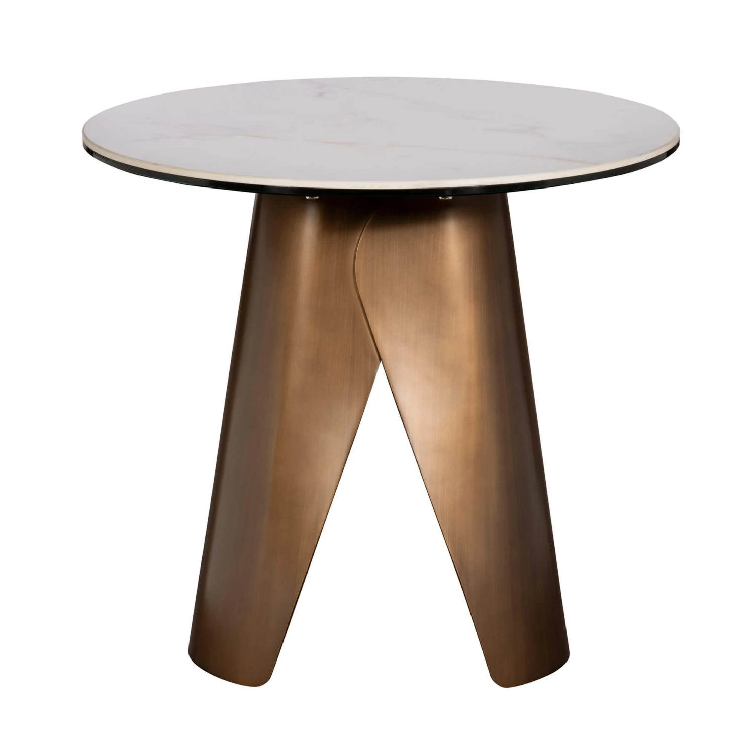 Beneath, the table’s architectural base makes a bold statement with overlapping, arching legs in a rich bronze-coloured finish. The twin flared supports form an open, sculptural shape, enhanced by a vertical brushed texture that catches the light beautifully. This distinctive design balances contemporary style with a sense of grounded elegance, making it an ideal centrepiece for any luxury living space seeking both visual intrigue and timeless appeal.