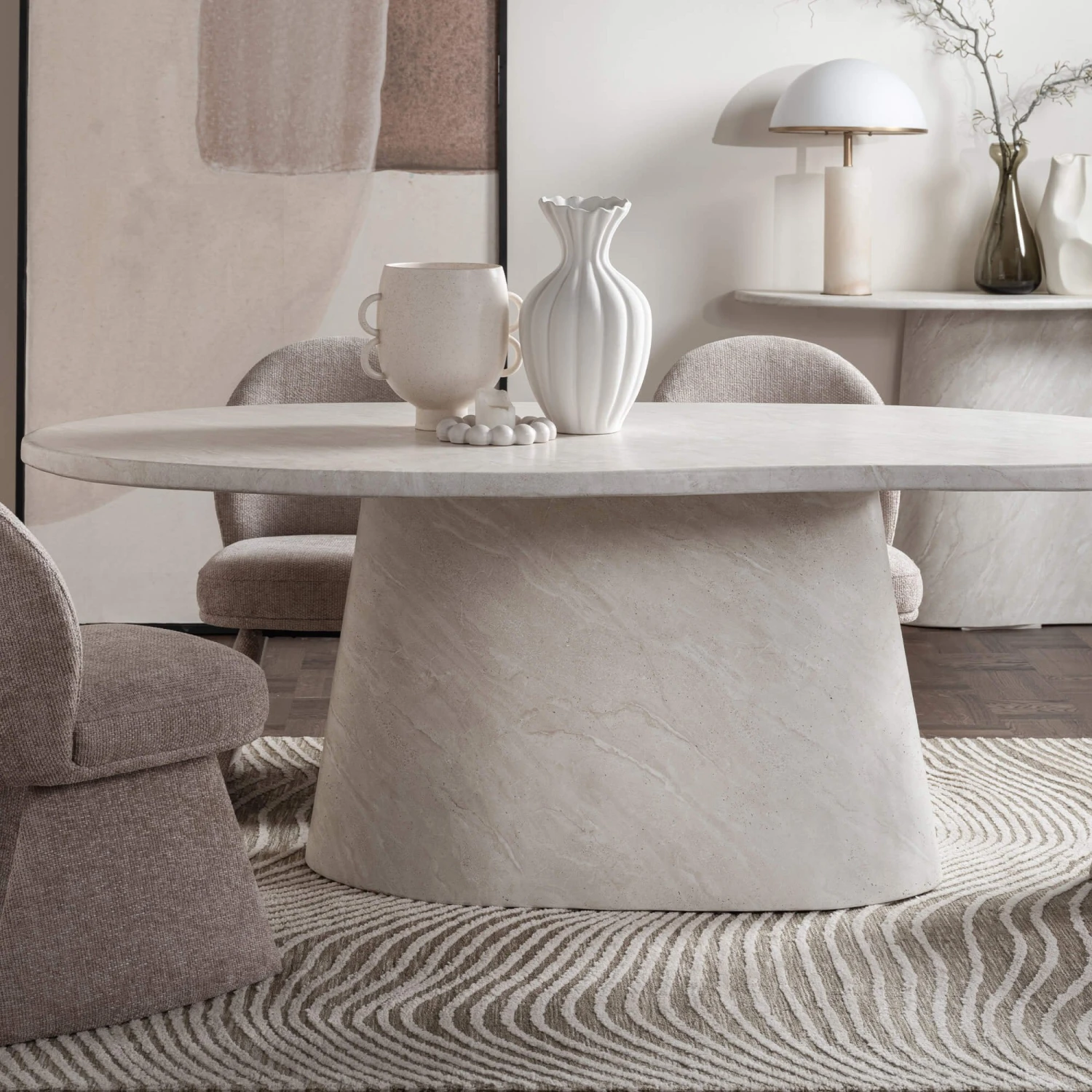 Supported by a large, sloping podium base, the Glass House Solna 200cm Travertine Effect Dining Table offers exceptional stability and a sculptural presence that enhances its organic appeal. Its neutral tones and understated design allow it to blend seamlessly with a variety of interior styles, making it the ideal neutral dining table for those who appreciate both style and versatility. Whether you’re seeking a travertine dining table or an organic dining table that stands out for its contemporary character, this piece promises to elevate your home with timeless sophistication.