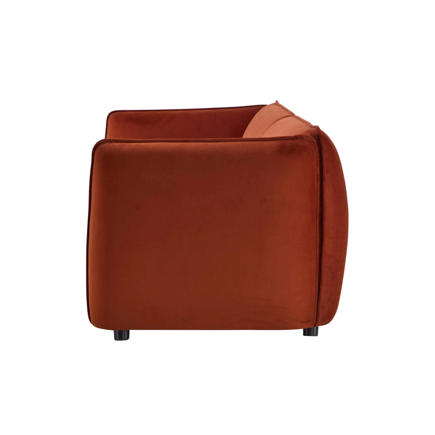 Upholstered in a rust orange fabric, the Thorne features generously padded cushions, straight arms, self piping and black painted wooden legs, creating an inviting yet sophisticated piece.
