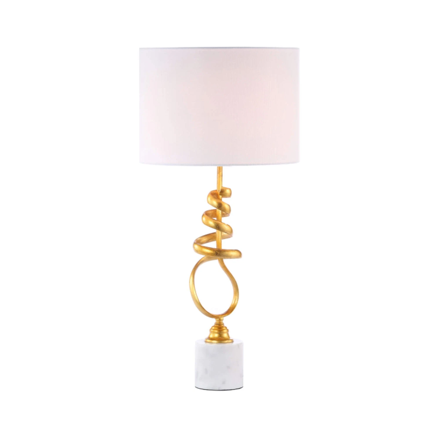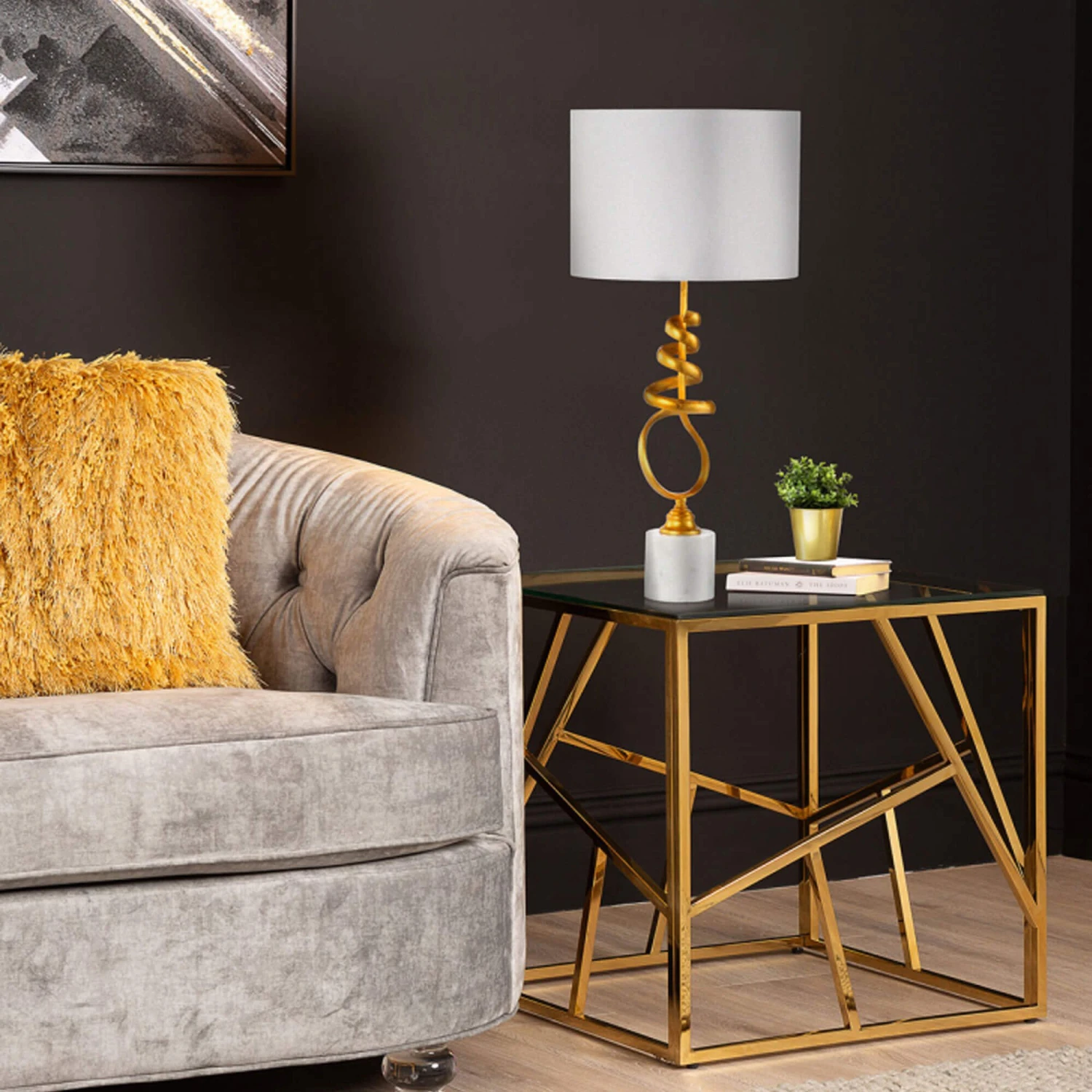 Add a touch of luxury and style to your living space with this Gold Knot Table Lamp With White Linen Shade. Illuminable by an E27 LED fitting, this exquisite table lamp features a white linen shade with a gold knot metal body and a white marble base, casting a soft and ambient glow. Effortlessly blending opulence with modern sophistication, this statement table lamp will elevate any room and is perfect for adding a sense of grace and elegance to any décor, making it ideal placed in an contemporary interior with its beautifully striking appearance.