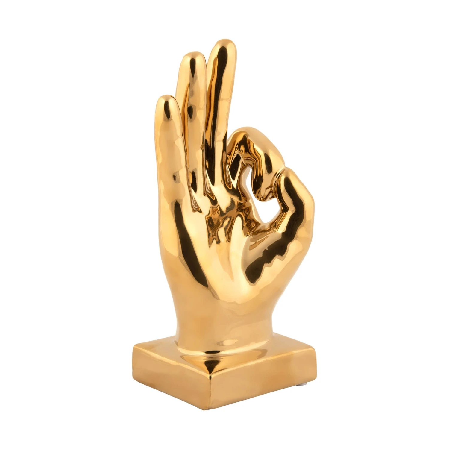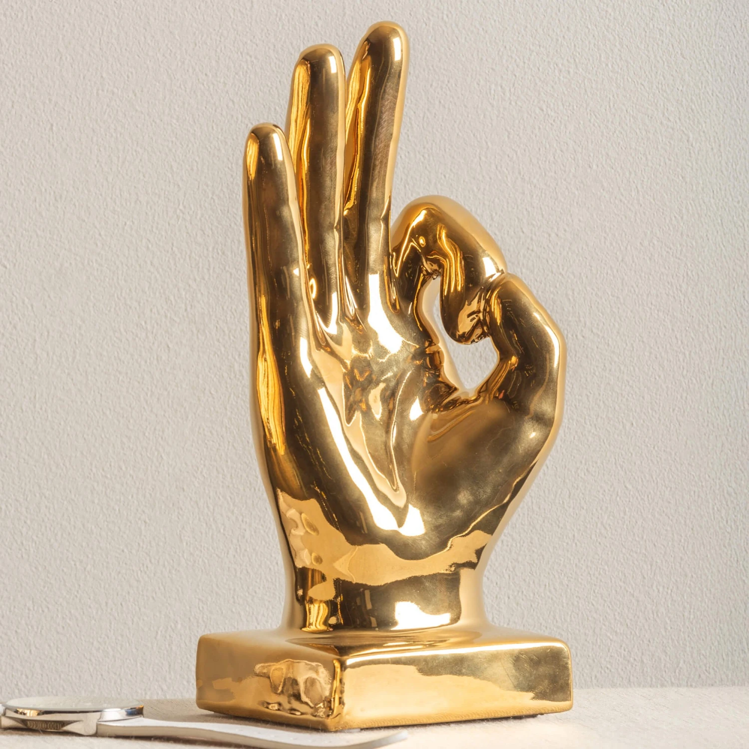 This small ceramic sculpture beautifully captures the iconic ‘Okay’ hand gesture, with the thumb and index finger forming the iconic circle while the remaining three fingers are elegantly extended, pointing upwards into the air. The entire piece is finished with a gold coloured chrome-plated effect coating, giving it a reflective, mirror-like shine that interacts dynamically with light and adds a striking, modern appeal. Mounted on a sturdy rectangular base, the sculpture is both stable and visually balanced, contrasting the organic lines of the hand with a solid geometric foundation.