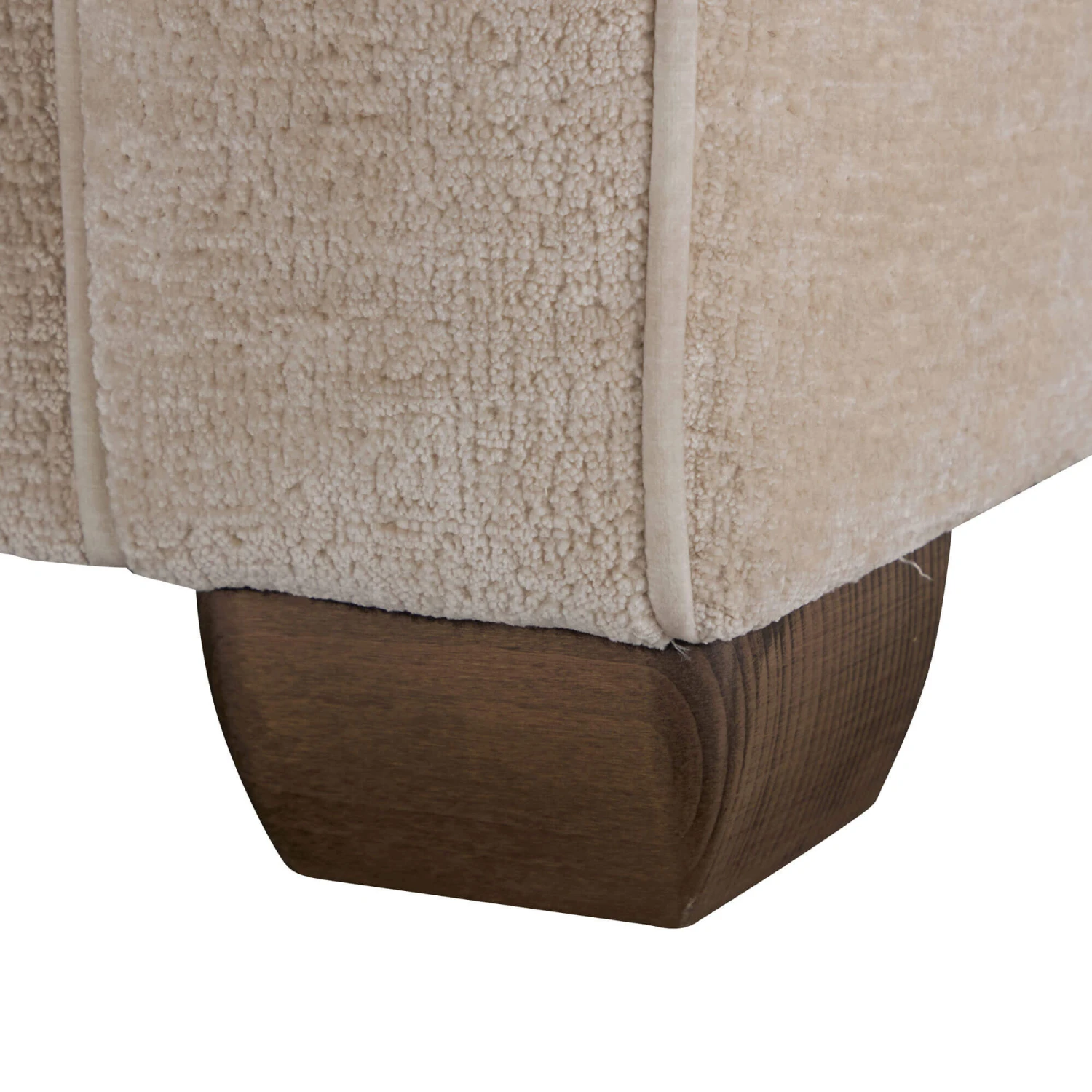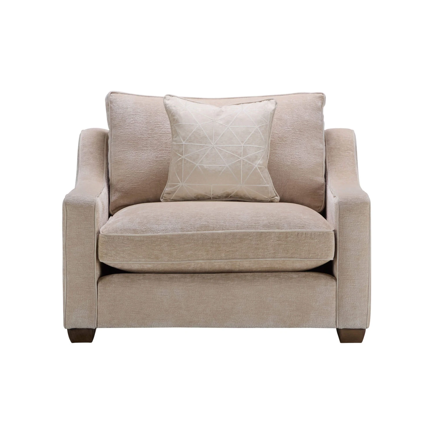 The Haddon Imperial Oyster Fabric Snuggler Chair is the embodiment of understated elegance and sumptuous comfort. Upholstered in a warm imperial oyster fabric with subtle texture, the Haddon features clean lines, elegant sloped arms, generously padded cushions, lovely almond piped detailing and contemporary mocha show wood stain legs, creating a timeless and sophisticated piece.