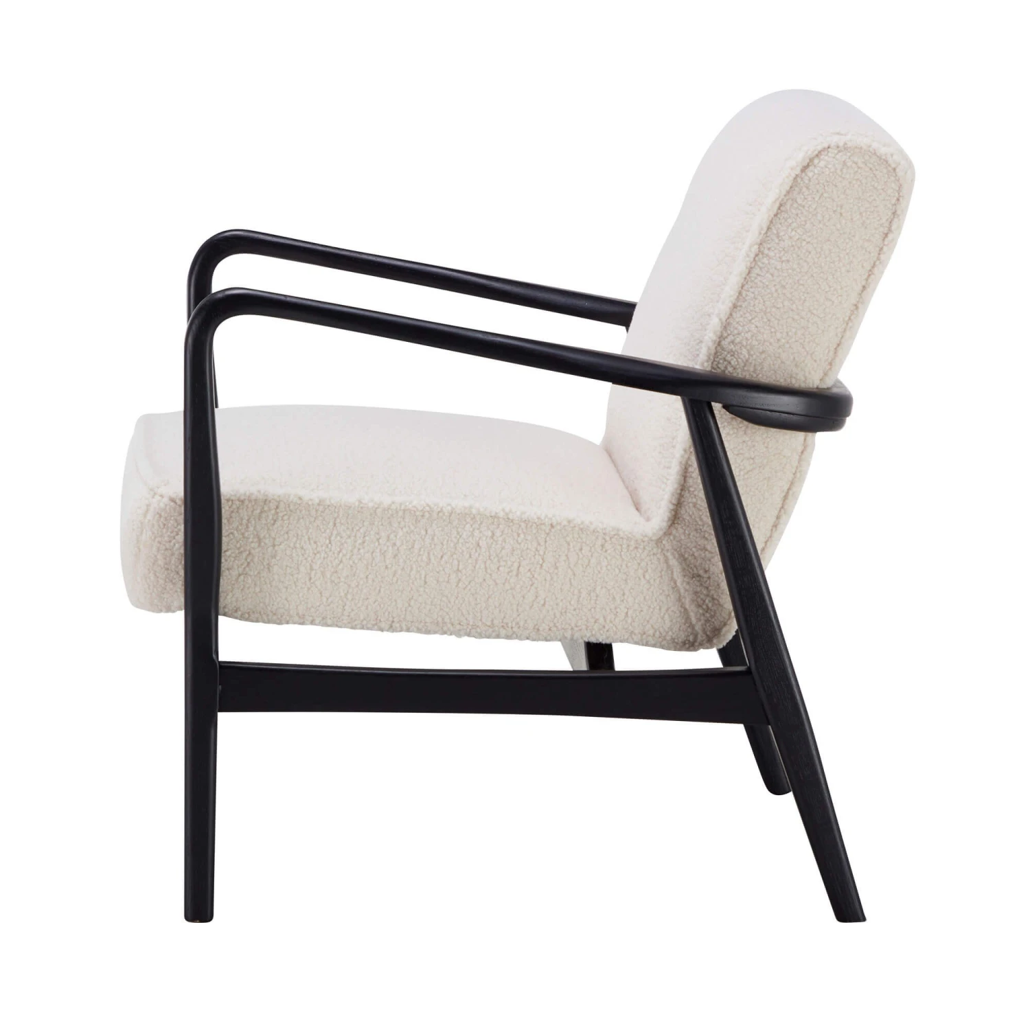 The smooth, curved lines of the frame create a sense of elegance and sophistication, while the black coated finish contrasts the soft, neutral tones of the fabric. The combination of these elements results in a piece of furniture that is both visually appealing and effortlessly stylish and reflects the look of a Fauteuil Chair.
