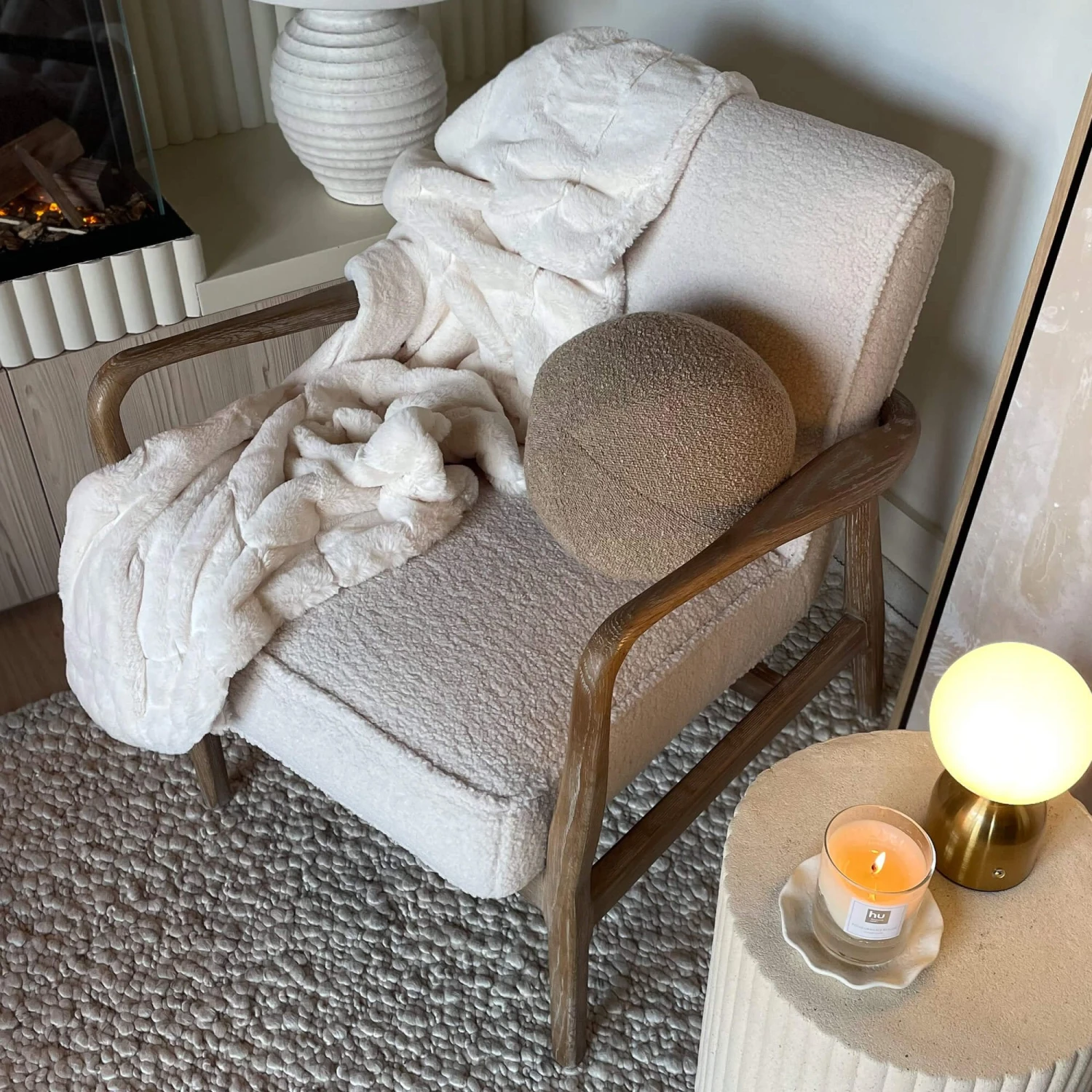 The smooth, curved lines of the frame create a sense of elegance and sophistication, while the natural finish complements the soft, neutral tones of the fabric. The combination of these elements results in a piece of furniture that is both visually appealing and effortlessly stylish and reflects the look of a Fauteuil Chair.
