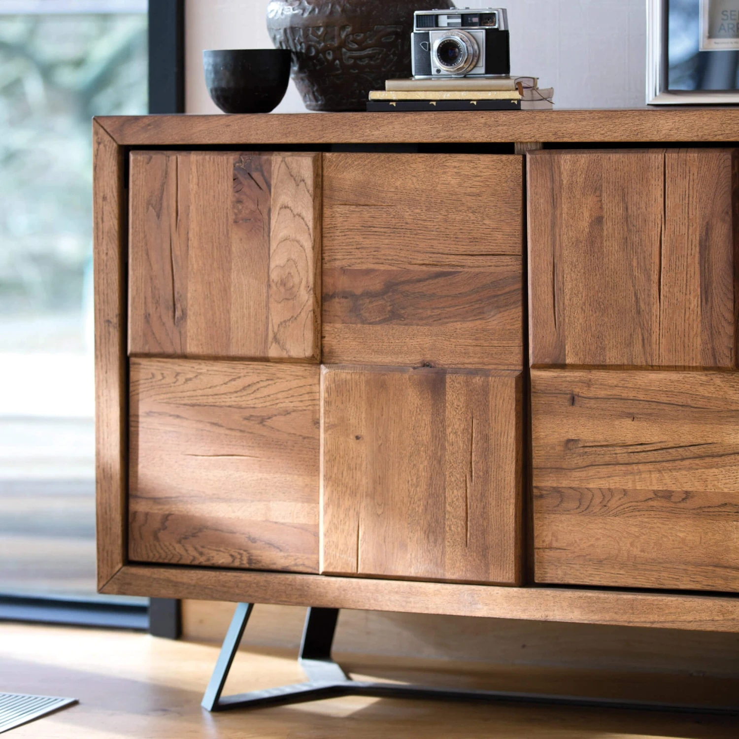 Accompanied with its unique, checkerboard style panelling with bevelled edges making a striking focal feature on the doors, the Harrington Sideboard is a true statement piece that is sure to enrich any décor with its contemporary aesthetic and artistic flair.