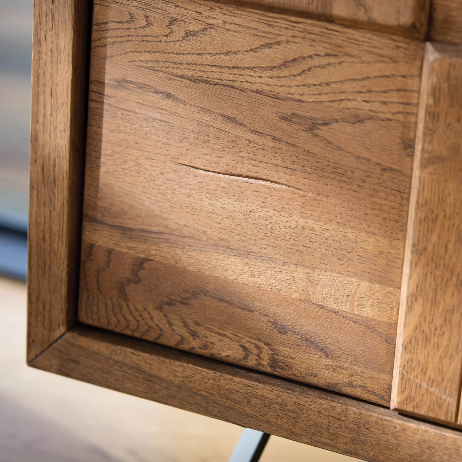 A true testament to industrial chic design, the Harrington Solid Oak 3 Door Sideboard highlights the beauty of natural materials in an unapologetically modern style. Crafted from a characterful solid oak with a dark natural oiled finish enhancing the varying grains and textures of the wood, the Harrington has a certain warmth and charm which is sure to radiate throughout its surroundings. The distinctive matte black metal base makes a statement with its bold, geometric lines and contrasts the textured appearance of the oak beautifully, whilst lending this sideboard its alluring urban edge.