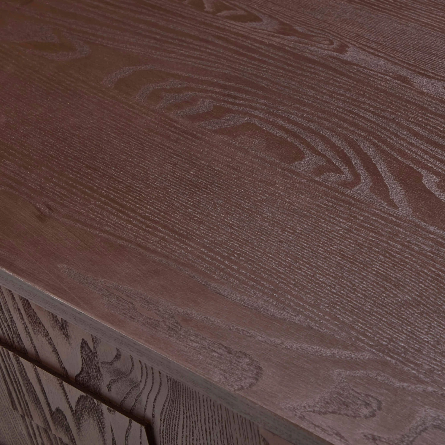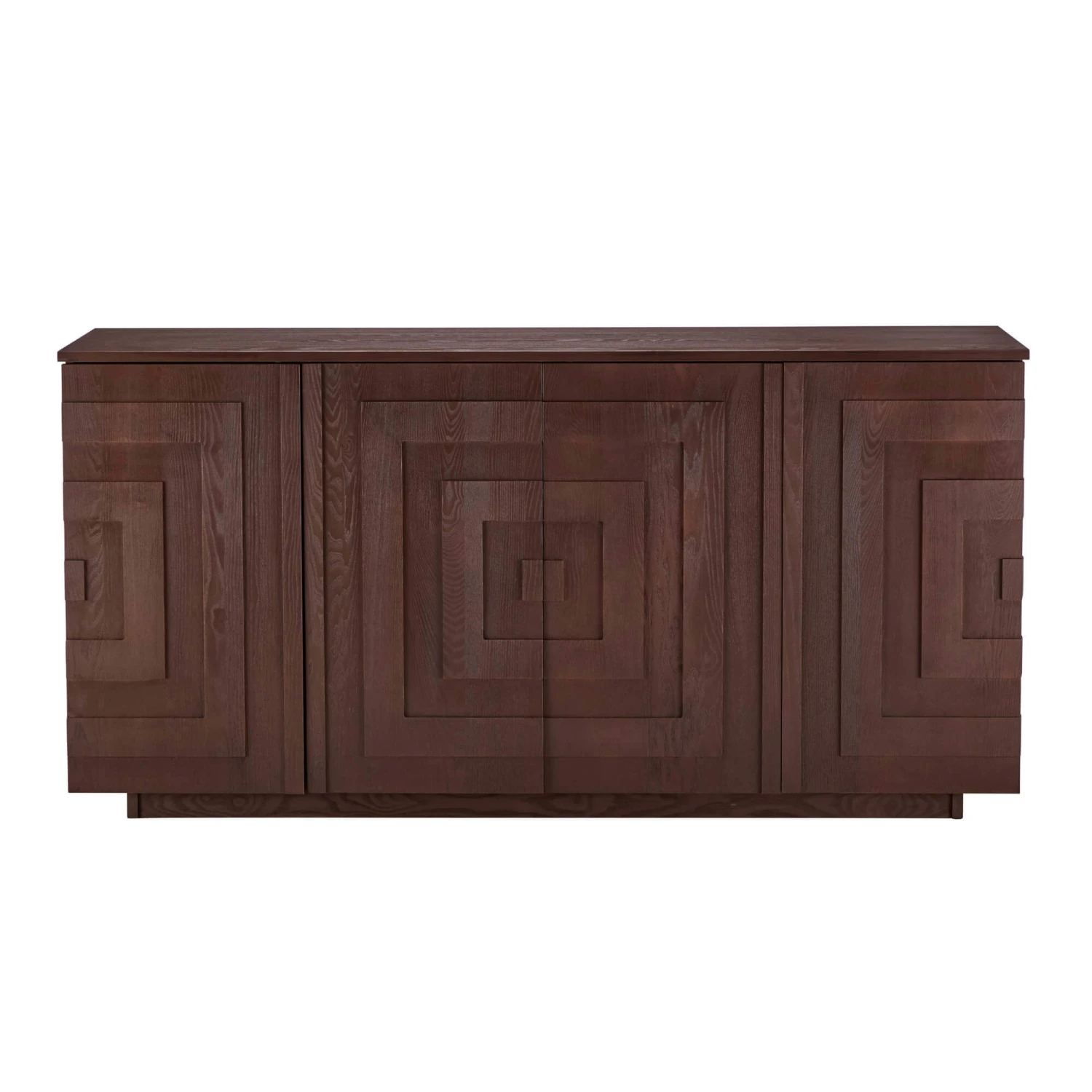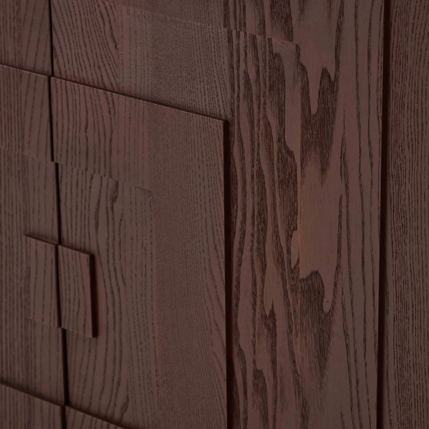 A contemporary sideboard inspired by Japandi minimalism meets warm Scandinavian design. The raised geometric pattern of squares adds depth and visual intrigue, while the dark timber textured wood grain delivers a tactile richness creating a mid-century feel. The thin top creates a sleek profile, and the podium base gives the sideboard a subtly elevated appearance, making it both functional and visually light within your living or dining space.