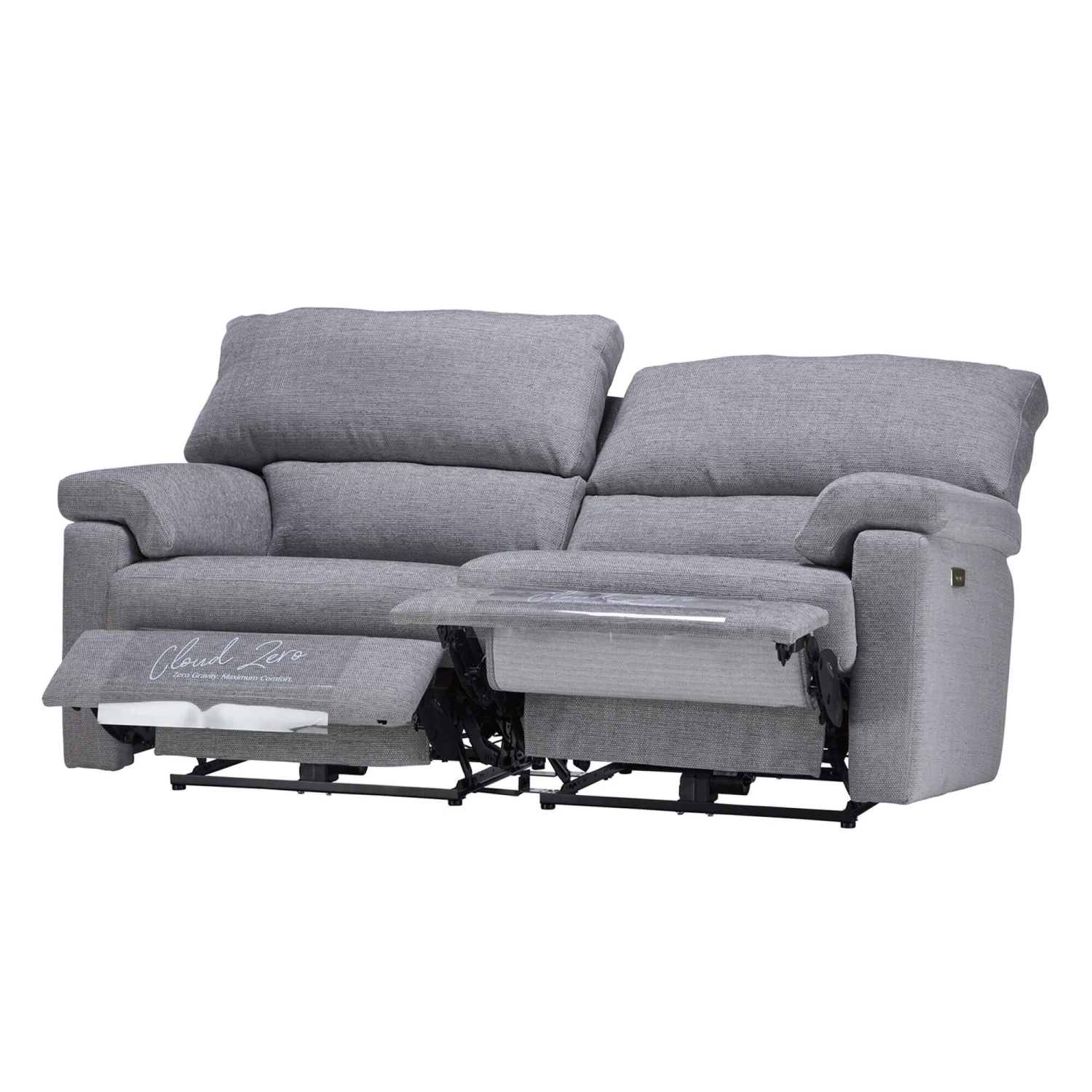 The Houston Grey Fabric 3 Seater Power Recliner Sofa is welcoming, distinctive and bold. Upholstered in a grey fabric, the Houston features sloped, padded armrests, generously padded cushions and black metal legs, creating a sophisticated and high quality piece.