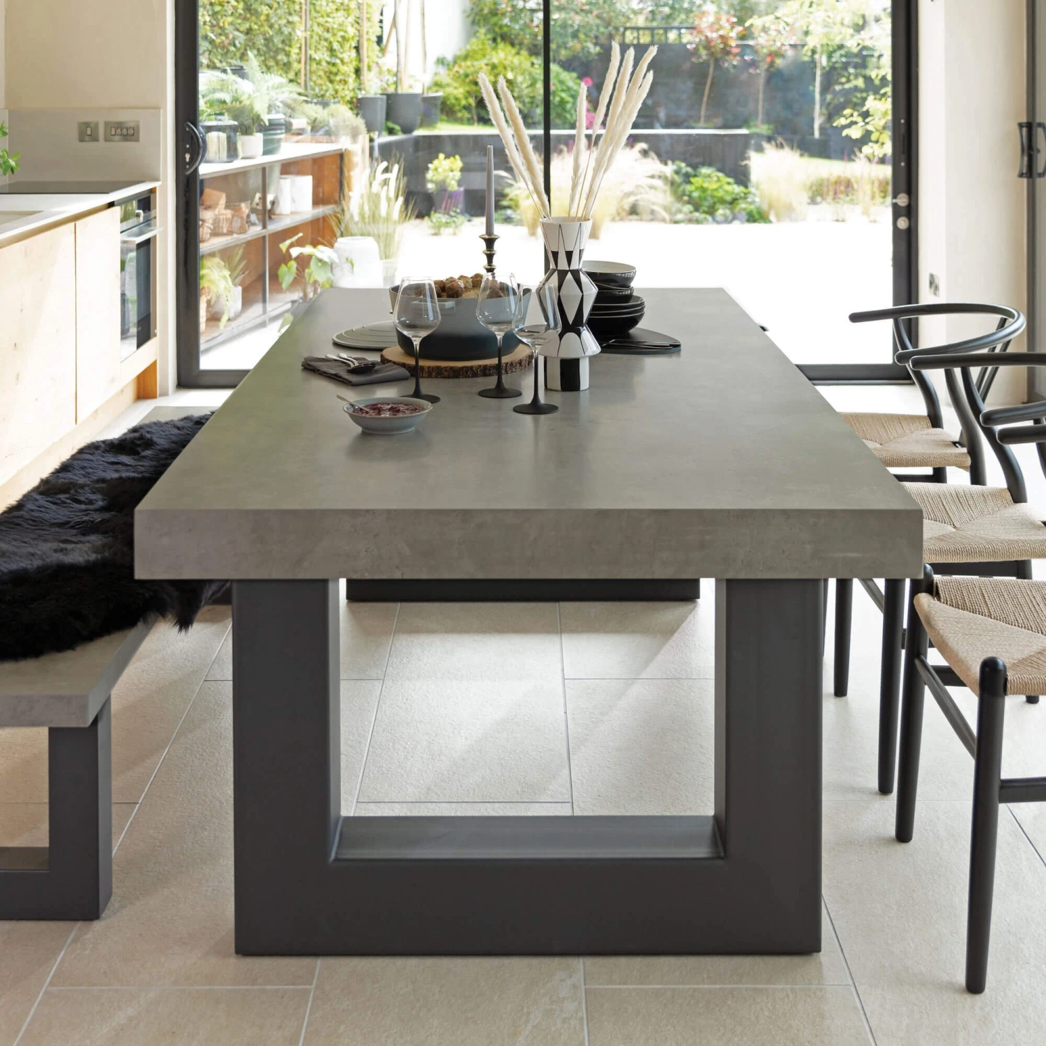 Urban industrialism at its finest, the Ingrid Concrete-Effect 180cm Dining Table is a large, modern dining table that is sure to take centre-stage in any dining area, with its immense size and striking features. The bold, chunky, structural style of the U-shaped, metal legs provide a striking contrast against the textural appearance of the top, with its large scale proportions and smooth, matte black finish. Completed with a concrete-effect, melamine coating on the top, the Ingrid is sure to refresh any dining room décor, with its on-trend, contemporary look and metropolitan flair.