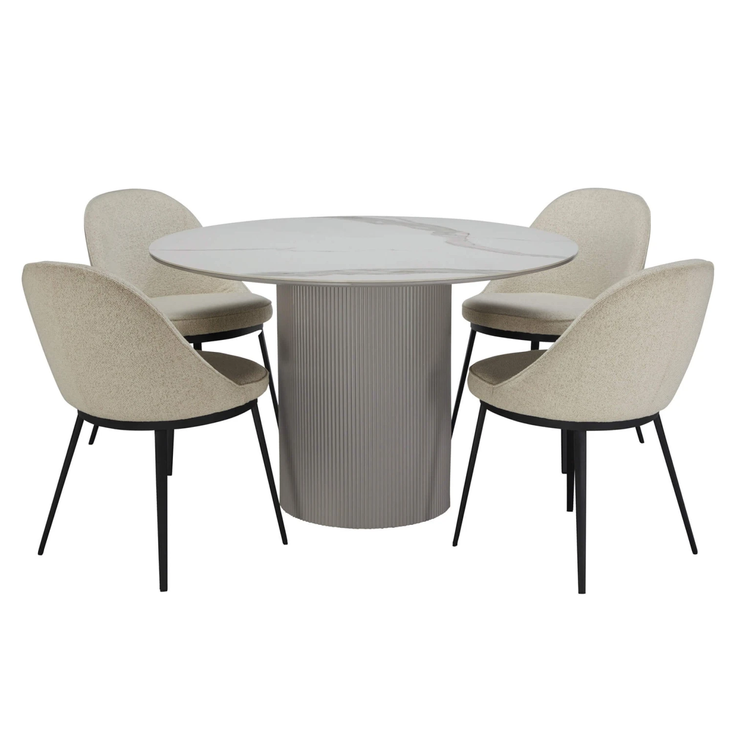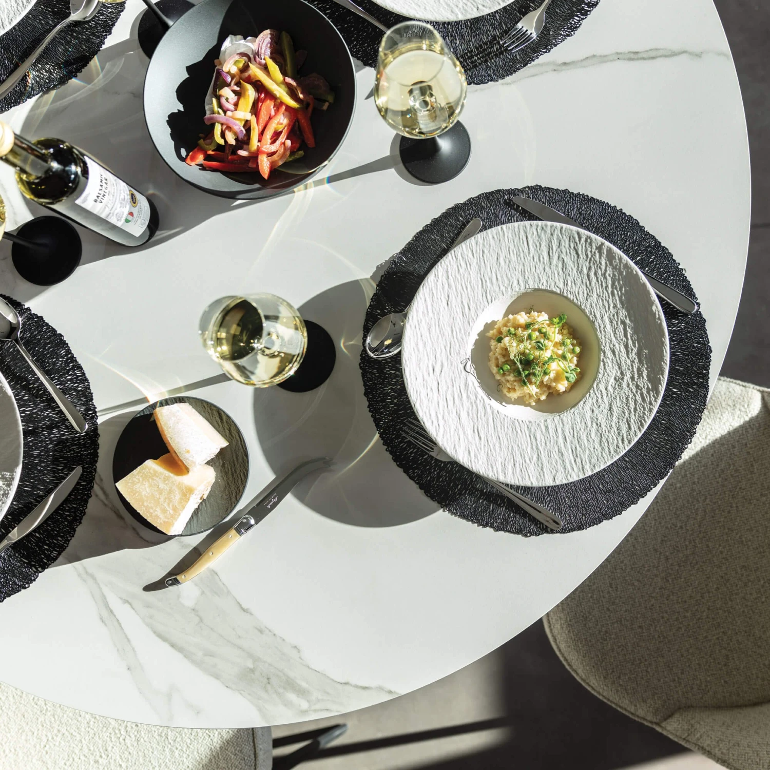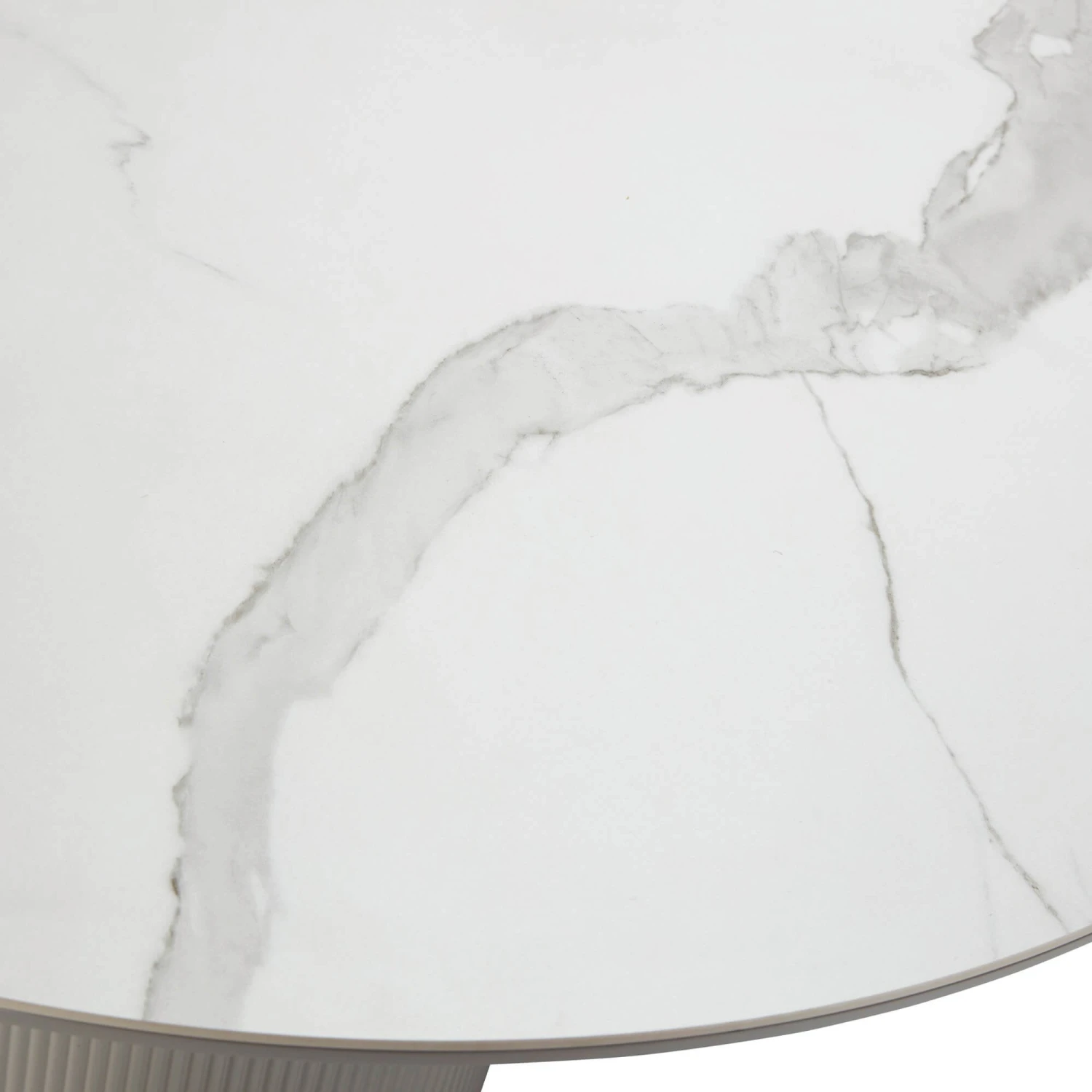 Make an elegant statement in your dining area with the Irina White Marble Effect 119.5cm Round Dining Table. Modern with an undeniable air of understated sophistication, the Irina is the perfect blend of classic style and contemporary details. Featuring a white china ceramic placed on a 6mm mdf top with varying veins and blooms in grey for depth and texture, the Irina Dining Table is a visually stunning piece with an authentic, natural marble look.