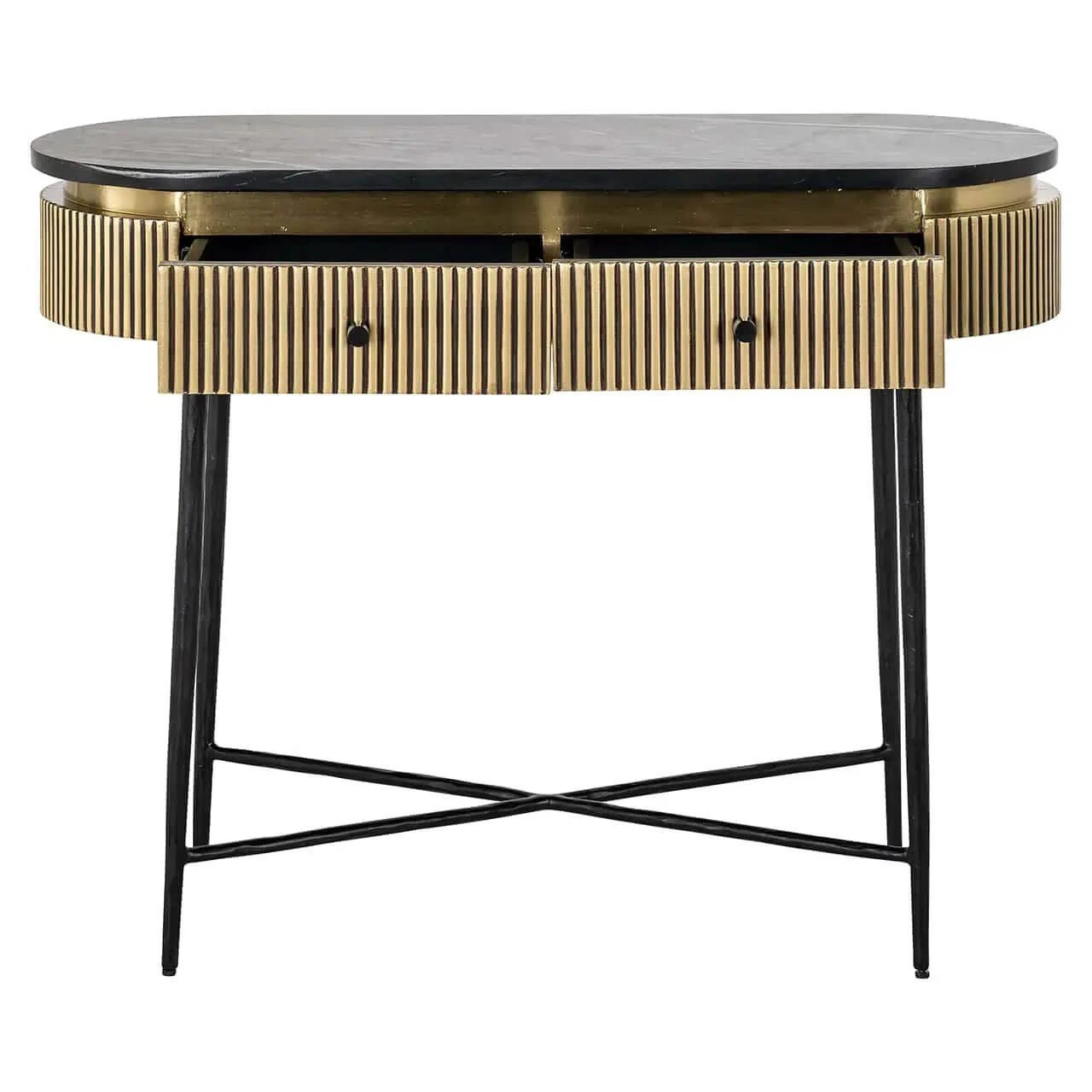 A sleek console table resting on slim black legs with a cross over design to add extra stability. The top is crafted with a rounded wooden edge in a brass finish and topped with a slim black marble and two small handles. This sleek and versatile table features 2 drawers for storage to keep your home organised.