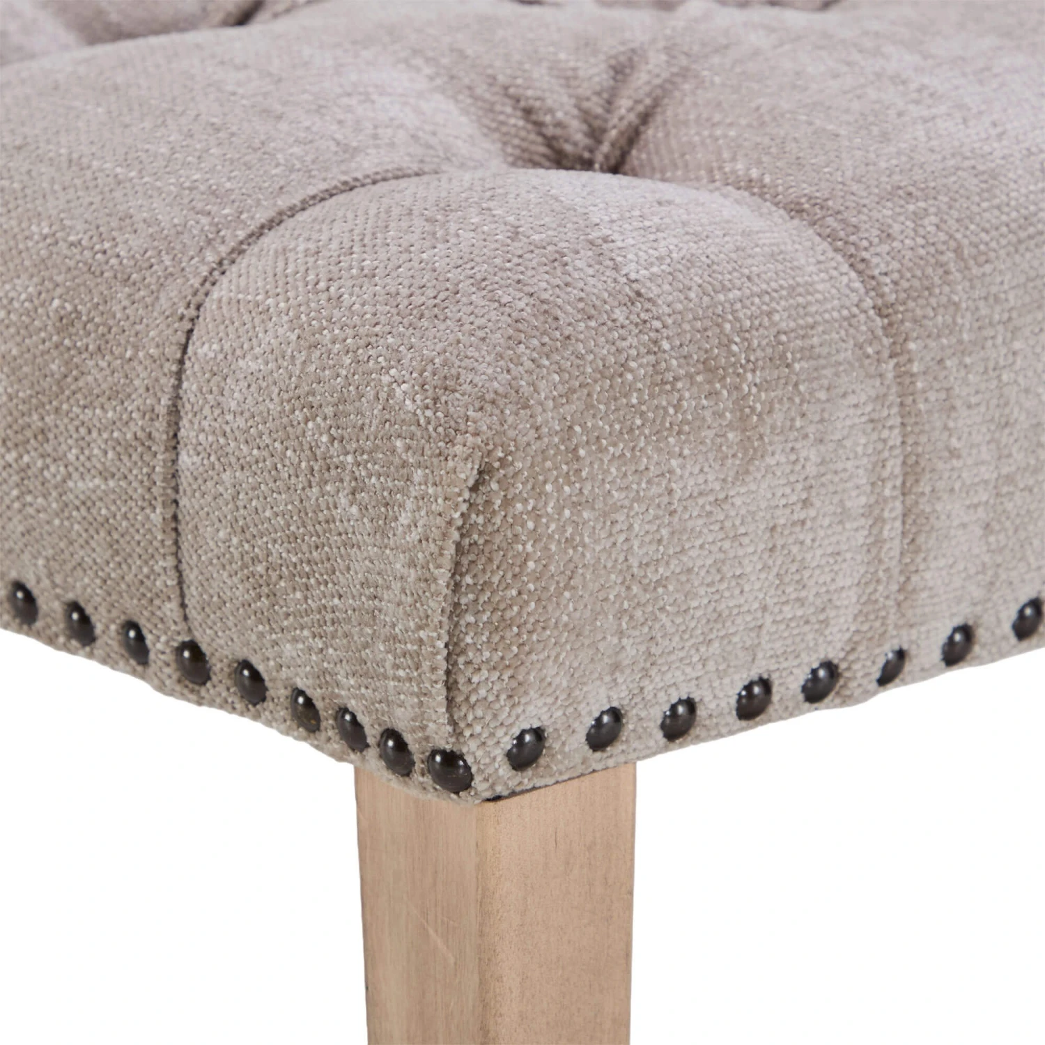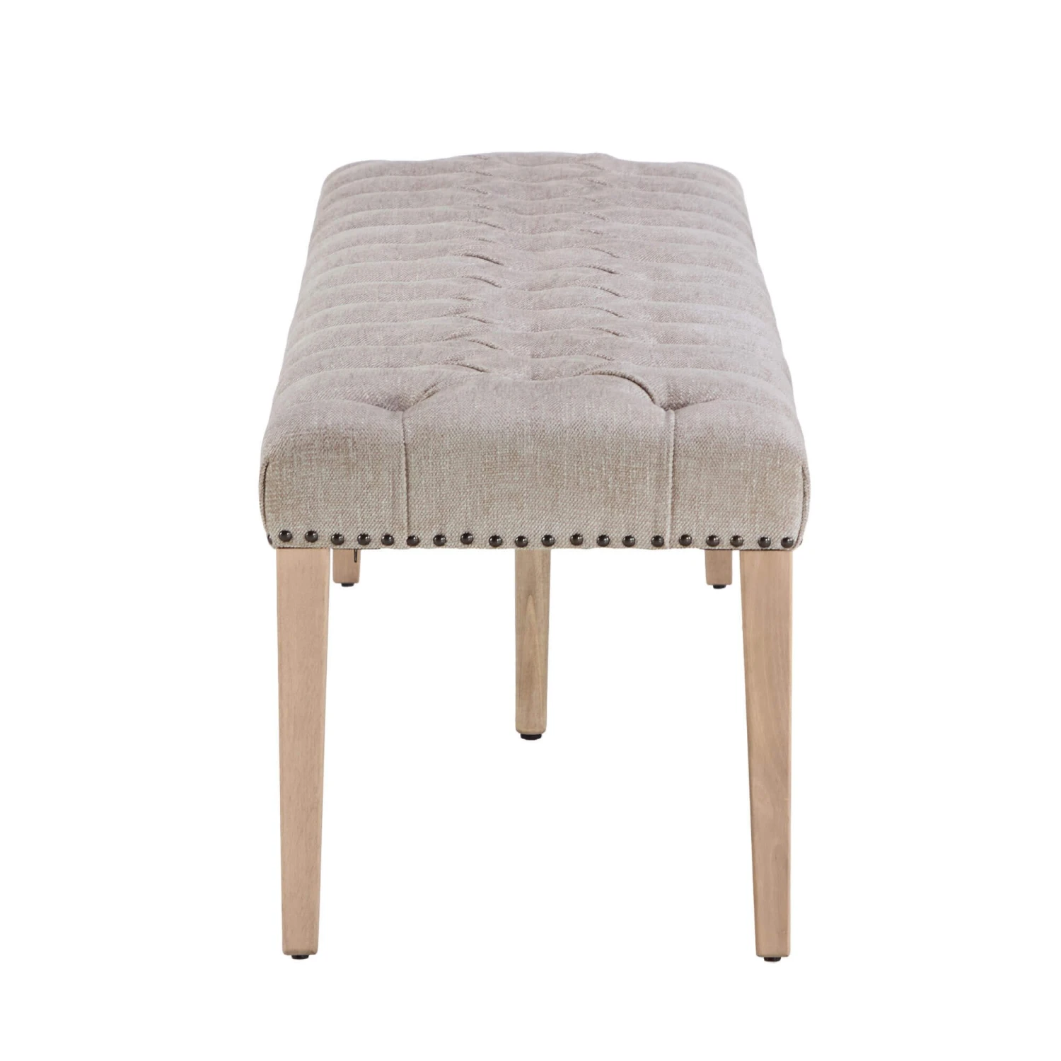 Alluring with its rustic charm, the Jacob Greige 200cm Fabric Straight Dining Bench is sure to bring the idyllic essence of country living to any dining area. Boasting a beautiful soft fabric upholstery with classic value tufting gracing the seat and a studded trim for accent detailing, the Jacob is the epitome of country chic with its elegant design and endearing features. Accompanied with its wooden legs in a neutral brown wash finish, the Jacob Dining Bench has an attractive, rustic-infused aesthetic which is bound to enhance any home décor.