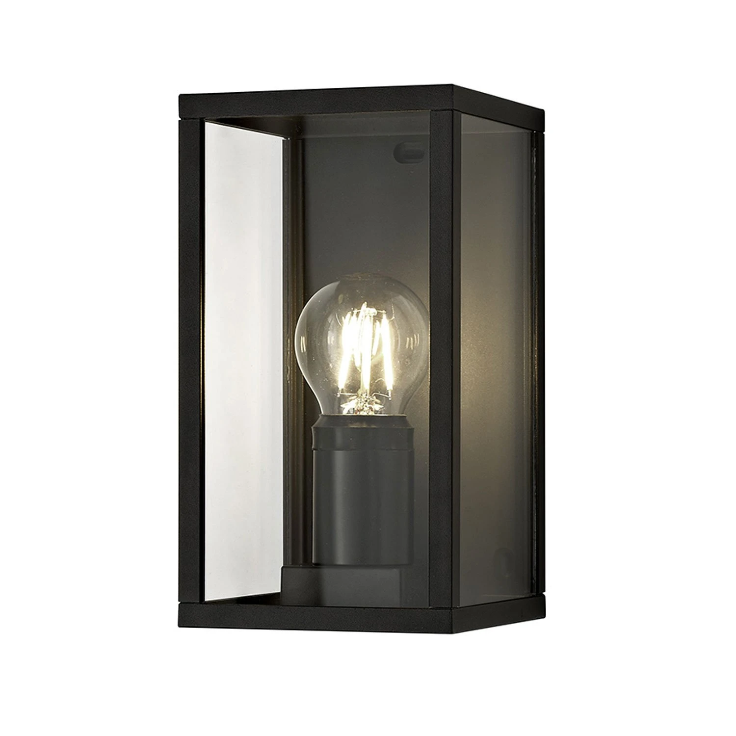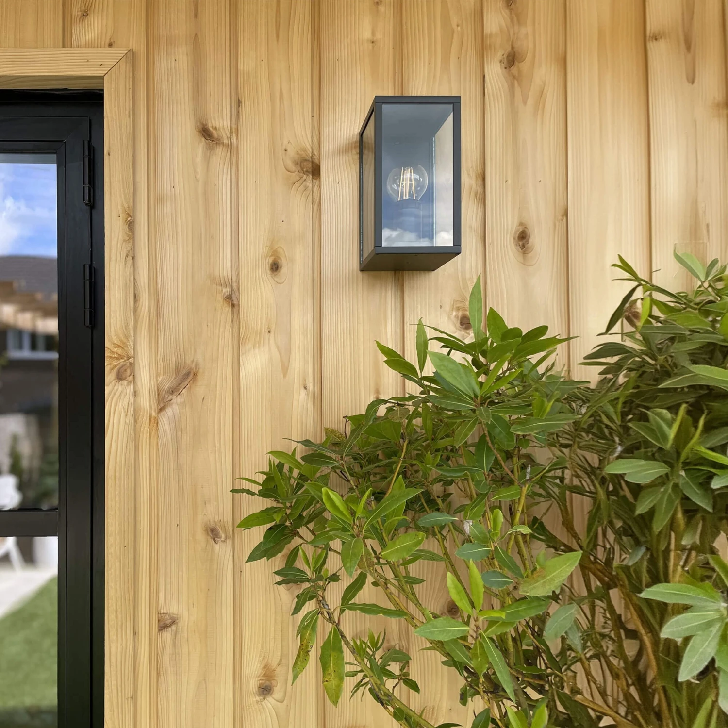 Theย Jama Graphite Black Outdoor Wall Light features a three dimensional frame with glass panels, drawing inspiration from traditional oil lanterns. The graphite black finish offers durability and longevity against outdoor elements and harsh weather.