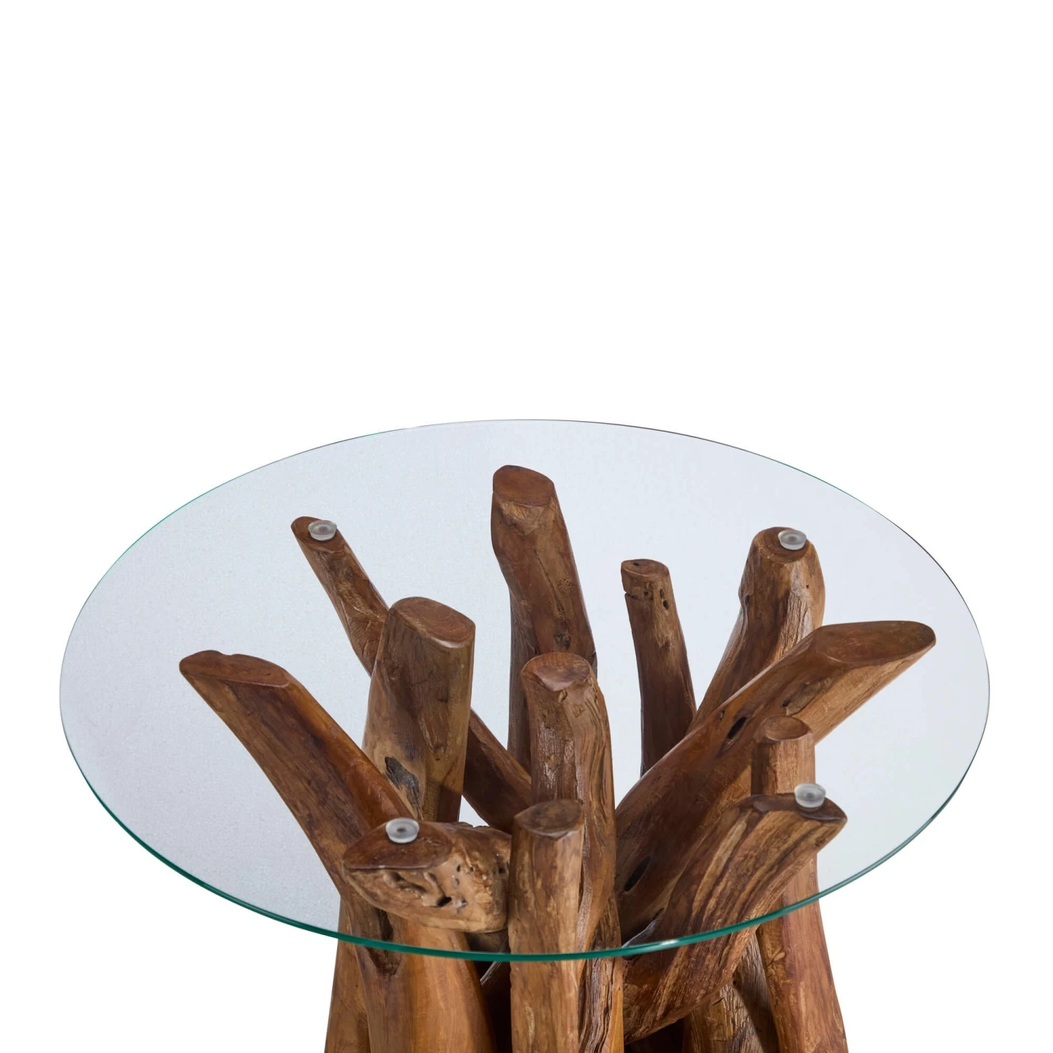 Beautifully crafted, this 60cm coffee table has a round clear glass top and a base made from sustainably sourced reclaimed teak root wood; providing a unique and striking focal feature for your living space. The table combines the beauty of natural wood with contrasting clear glass, and the fusion of modern design with a raw edge allows the table to complement a range of interiors.