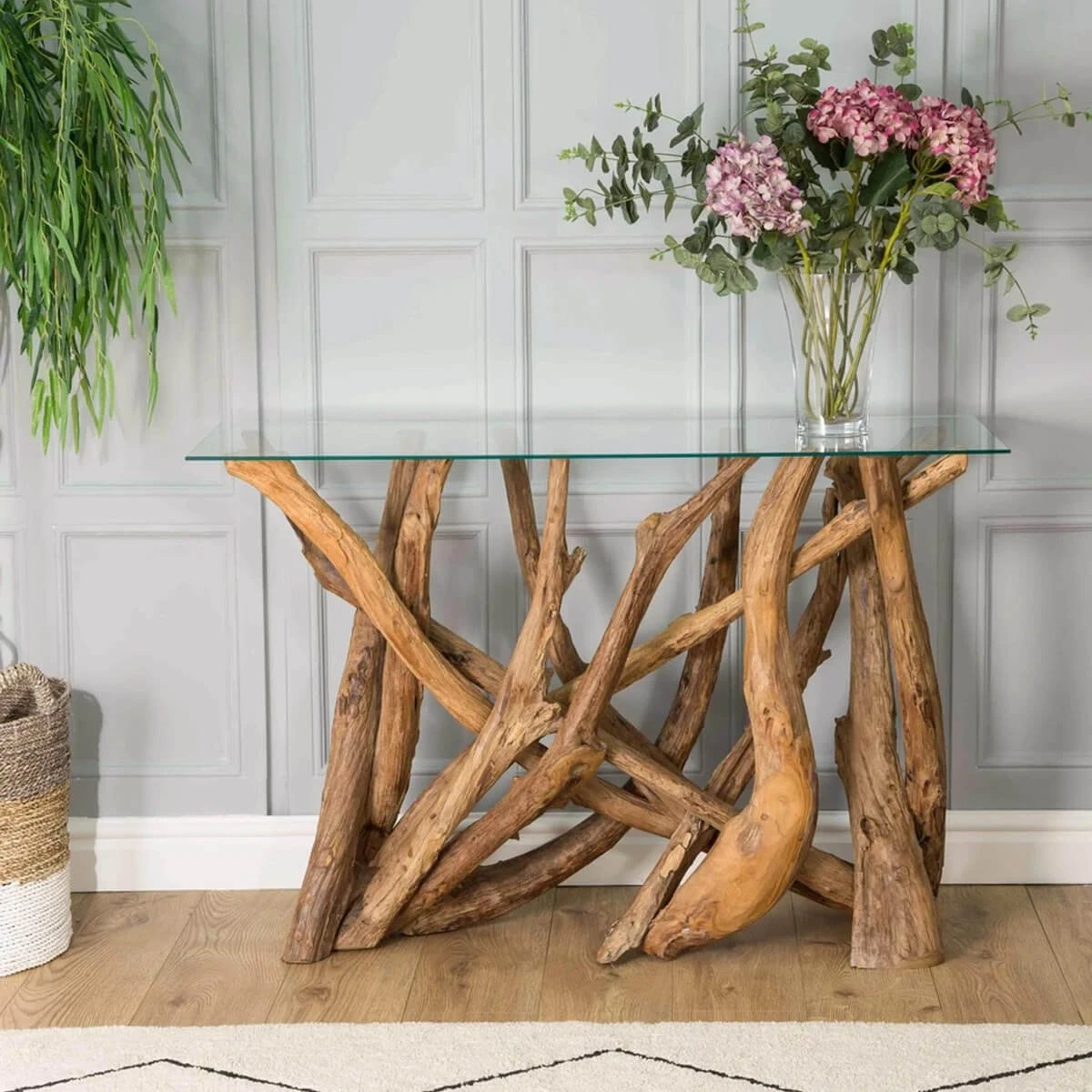 Beautifully crafted, this console table has a rectangular glass top and a base made from sustainably sourced reclaimed teak root wood; providing a unique and striking focal feature for your home. The table combines the beauty of natural wood with contrasting clear glass, and the fusion of modern design with a raw edge allows the table to complement a range of interiors.