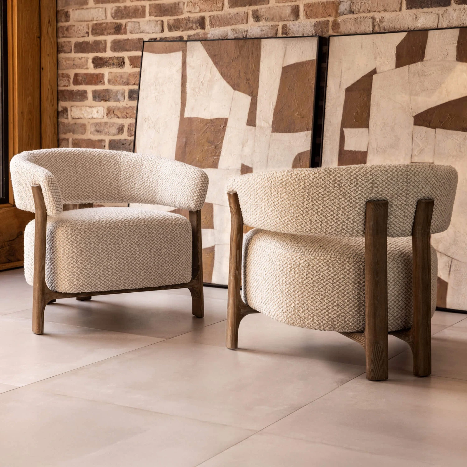 Cosy texture meets modern style with the Jesmond Cream Fabric Lounge Chair. Upholstered in a soft-textured cream fabric with a subtle pattern, the Jesmond features a gracefully curved backrest, a generously padded seat and a wooden frame, creating an inviting and elegantly sculpted piece able to offer exceptional comfort and stylish support. With an open back design, it has two central vertical wooden supports connected from the backrest to the seat, allowing it to add architectural interest and a sense of lightness to the chair.