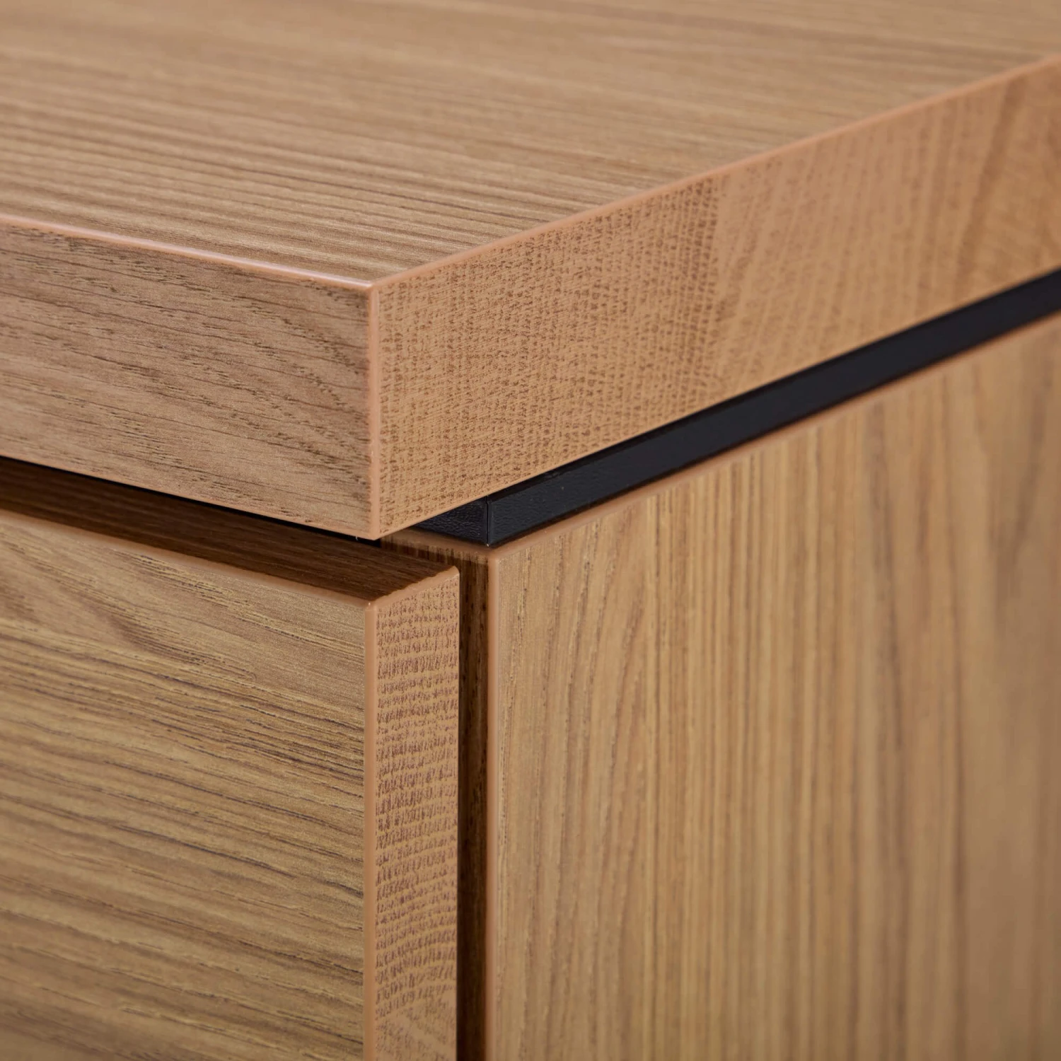 A simplistic 3 door tv unit that is crafted from durable wood and is finished in a light oak finish, adding a contemporary touch. Supported by sleek black metal legs, and a central leg for added stability, the design is both sturdy and visually appealing. The cable port at the top of the unit keeps wires neatly managed and allows them to remain hidden whilst plugged into items inside the unit. Designed for modern living, the TV cabinet features a spacious interior with push-to-open doors that fold down smoothly.