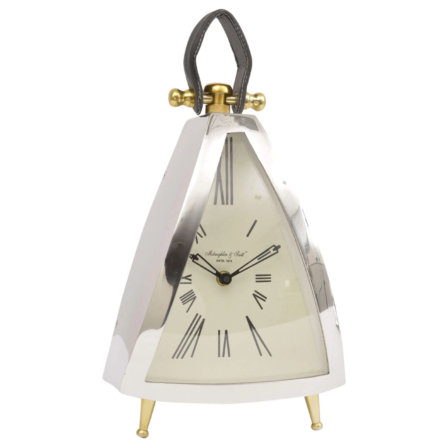 Add a contemporary look to your home with this stylish polished nickel mantel clock. The large Isosceles Mantel Clock has a unique curved triangular shape and is finished with brass feet and bracket and a black leather handle trim. With a roman numeral face, this eye catching piece would fit perfectly with a modern interior. At 36cm tall, this chic mantel clock would make a statement piece that is ideal for displaying in a lounge or study.