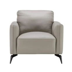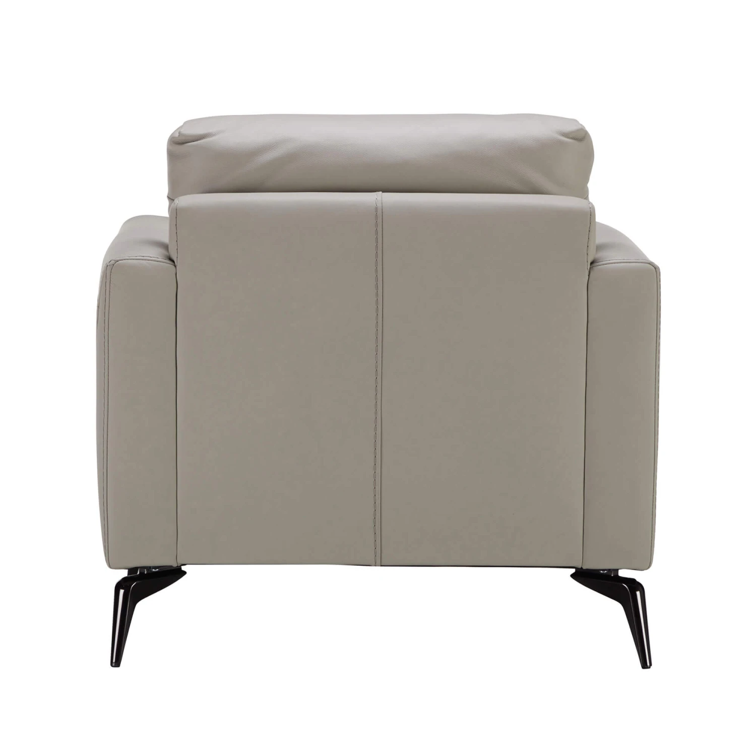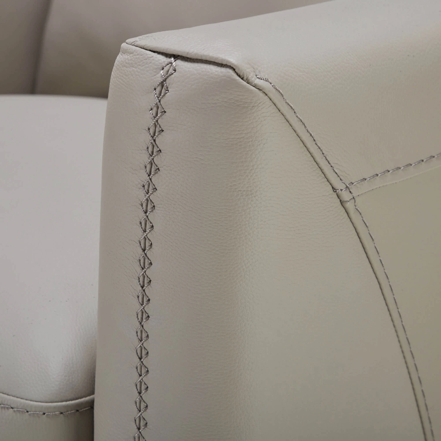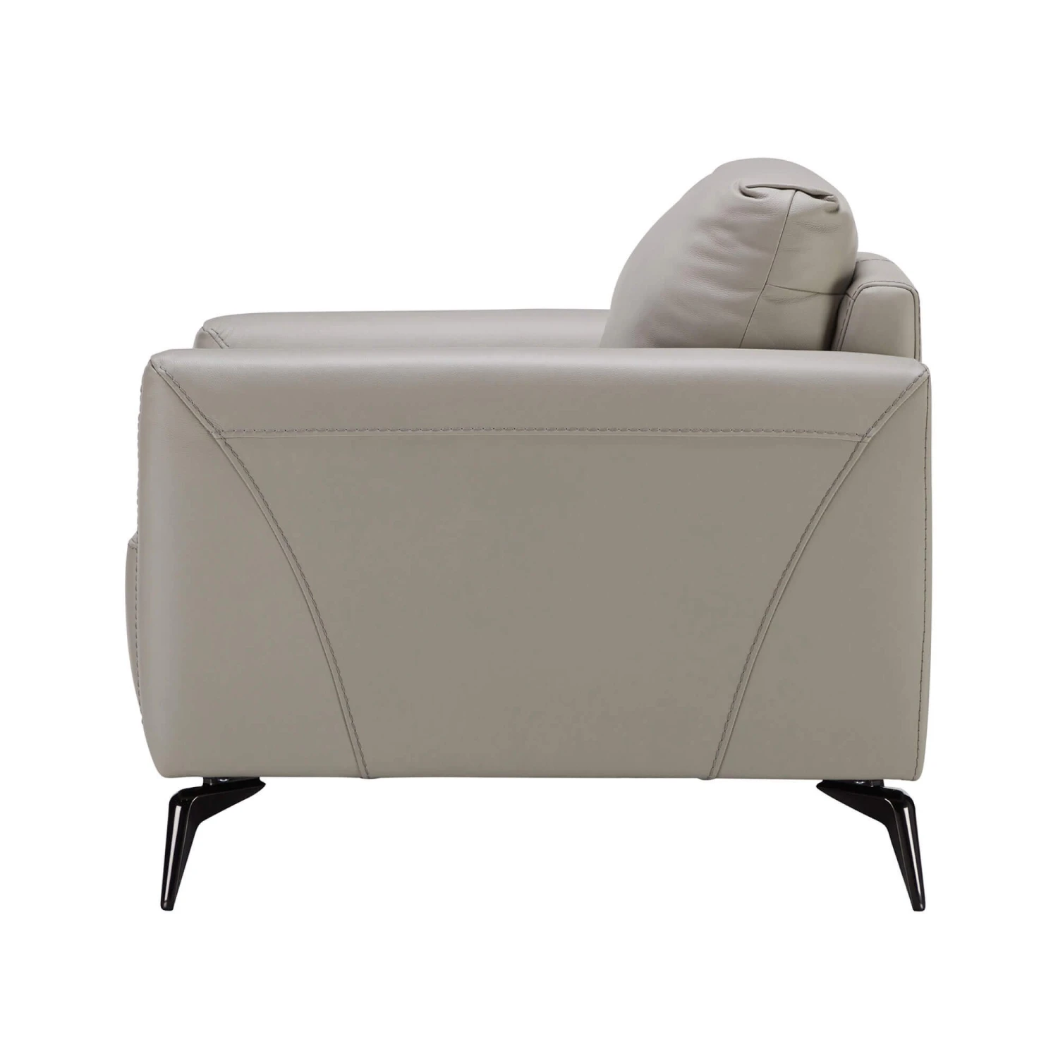 The Lariano Light Grey Leather Armchair is minimalist and contemporary in design. Upholstered in a charming light grey leather, the Lariano features stitch detailing arms and back, a generously padded back and seat cushion, and black metal legs, creating a clean and welcoming look.