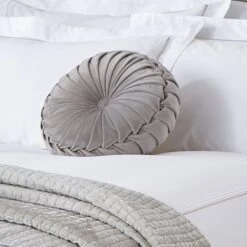 This beautiful Rosanna Steel Round Cushion by Laura Ashley features elegant pleats made from sumptuous velvet. Prefilled with a polyester circular pad, it is a perfect and glamorous finishing touch to your bedding set. Layer and enhance your bedding with a variety of coordinating cushions and throws, also available from the Laura Ashley collection.