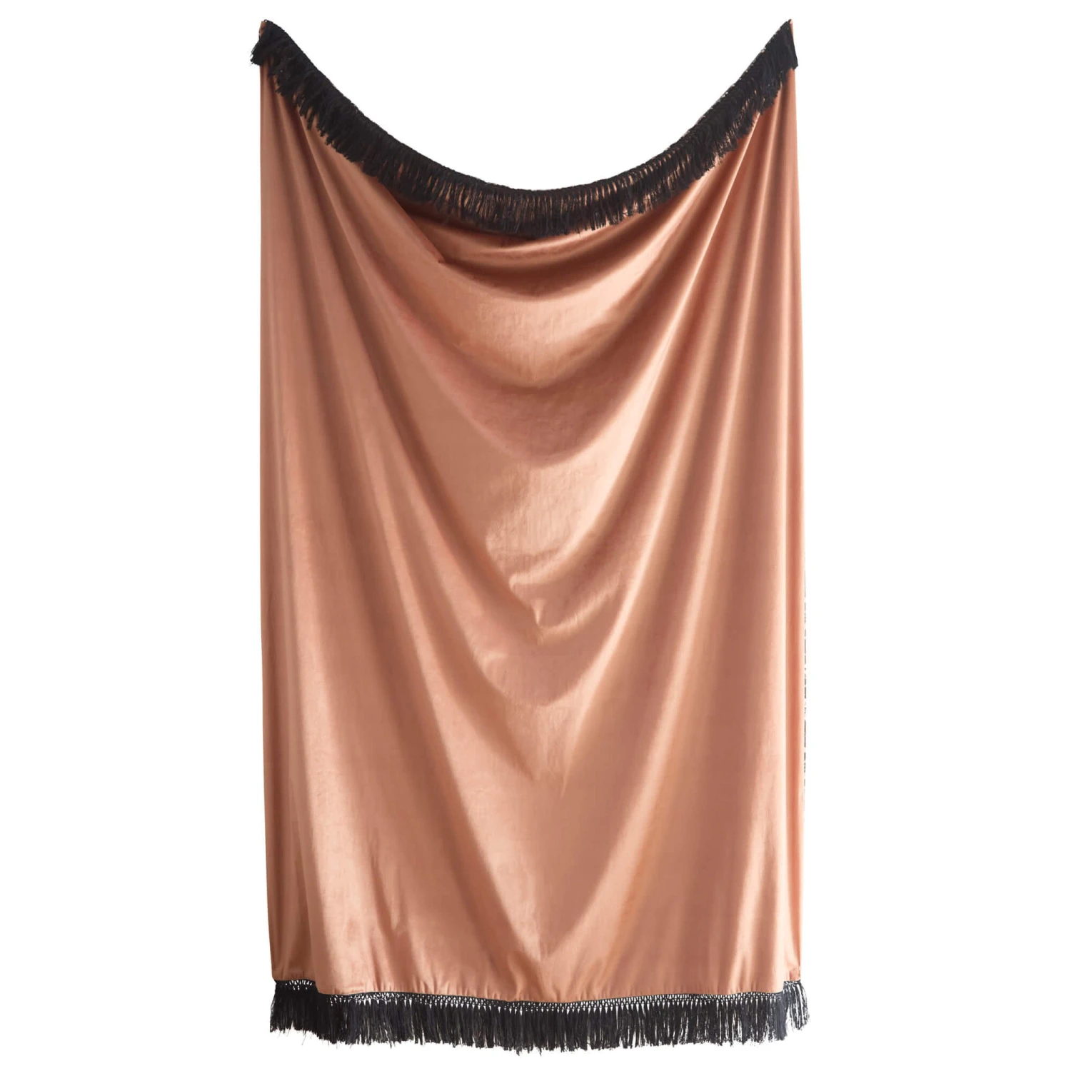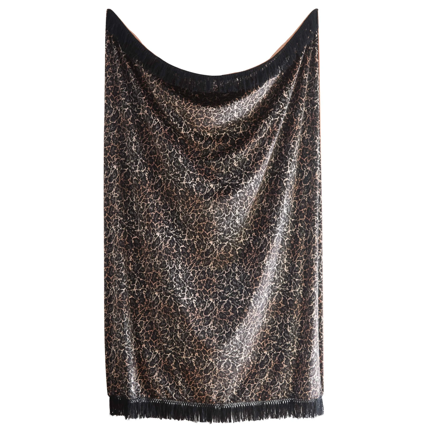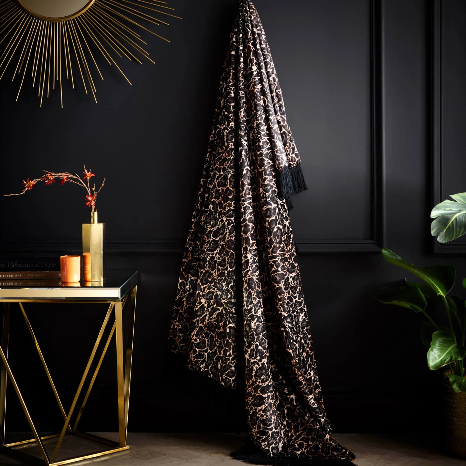 A striking velvet black and gold throw that features a printed leopard print pattern on the front side. On the reverse is a wonderful plain, rose gold colour which compliments the fabric fringed edge of the throw.