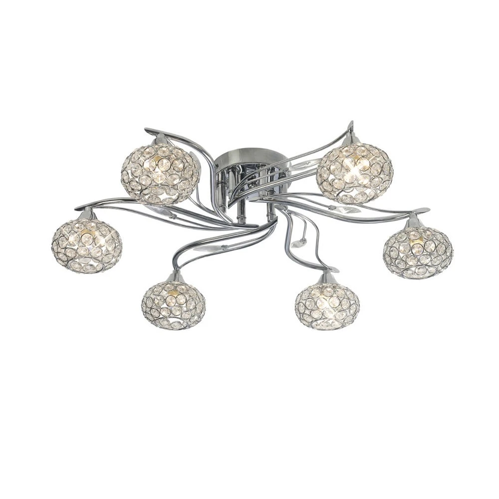 Elegant framework housing a crystal leaf make this collection from Diyas that extra special and unique. Illuminable by six G9 bulbs, this flush ceiling light has a polished chrome finish. The decorative crystal filled shades are also a statement yet do not overwhelm the items, thus ensuring the full fitting gets all the attention it deserves.