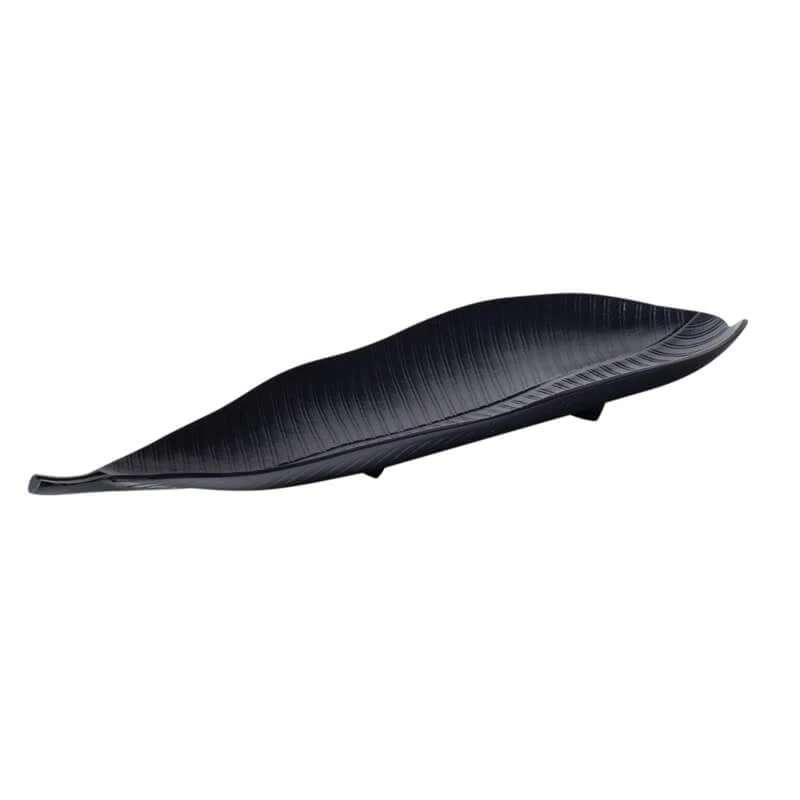 A large contemporary dish that mimics the silhouette of a tropical leaf. The edges of the leaf curve upwards adding a dynamic shape to the leaf and with an all black finish, it makes it a versatile decorative piece to match any modern home decor.