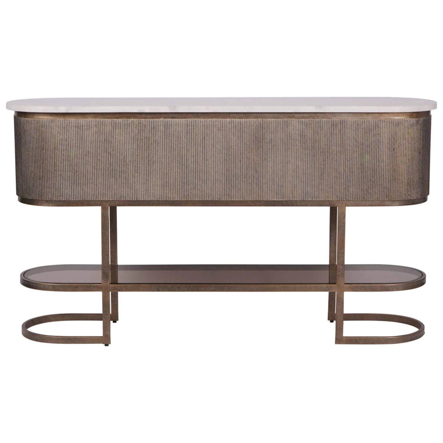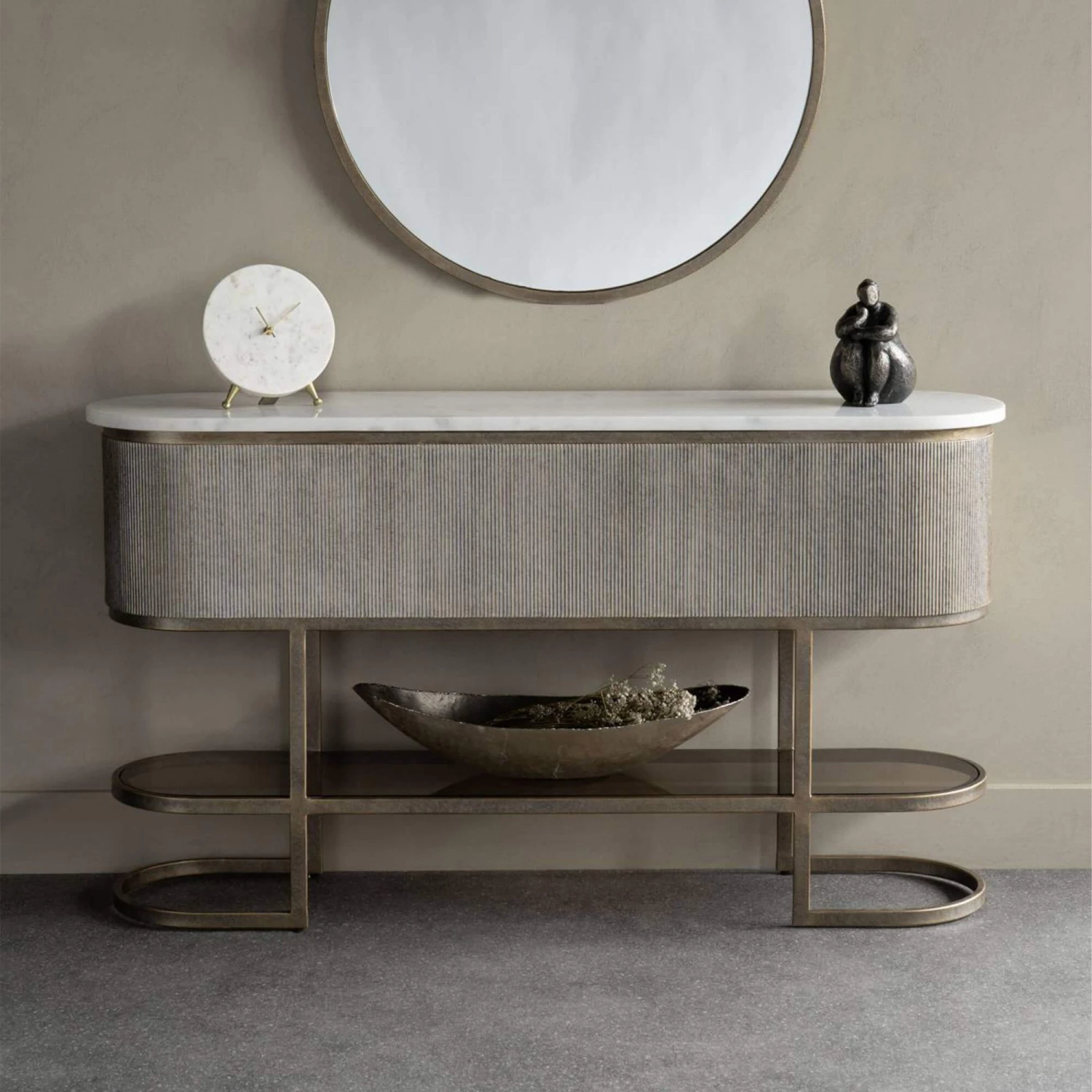 Intersecting the legs is an tinted glass shelf that creates additional storage, making it perfect for displaying accessories. The legs round out towards the end, mirroring the oval top, creating a complimenting contemporary style.