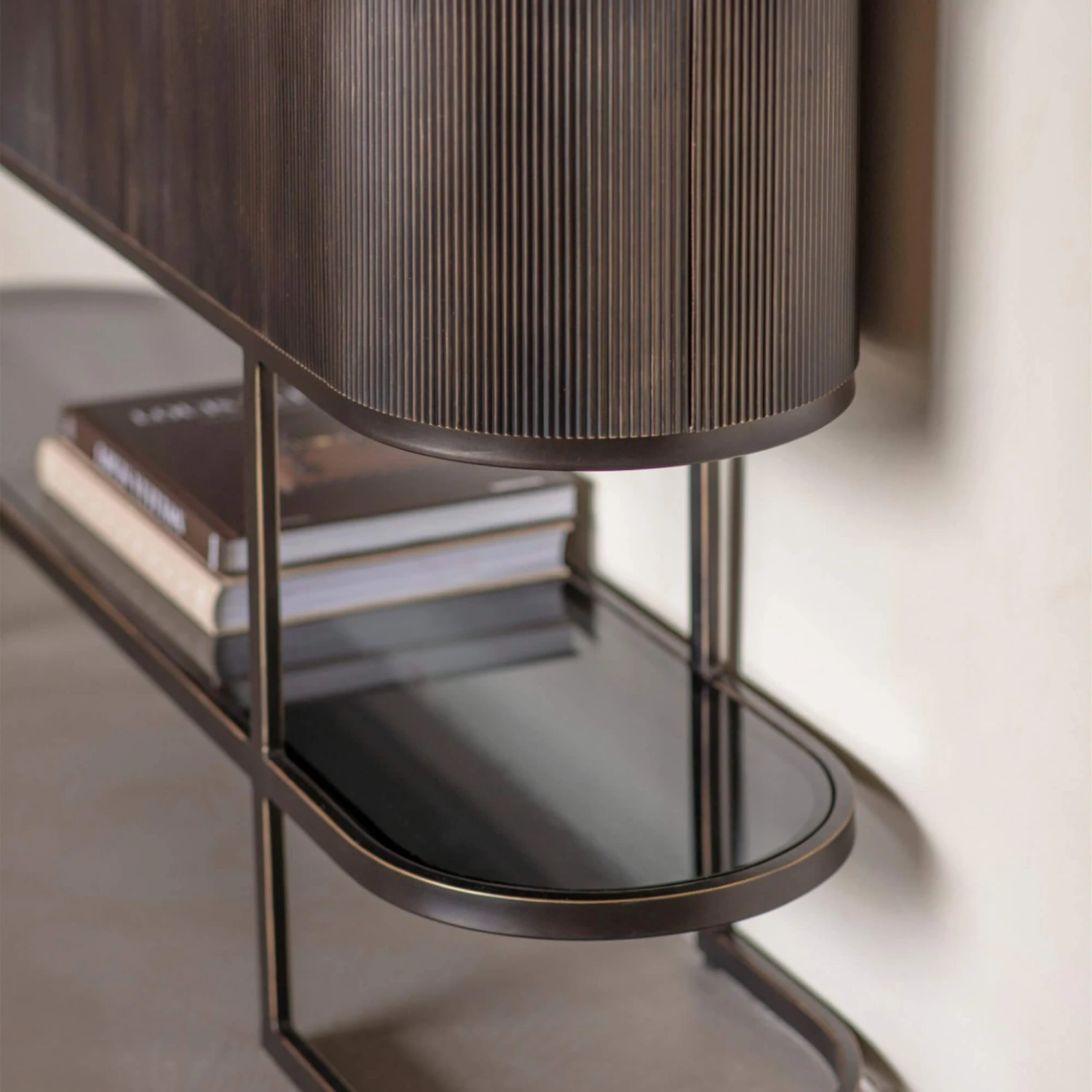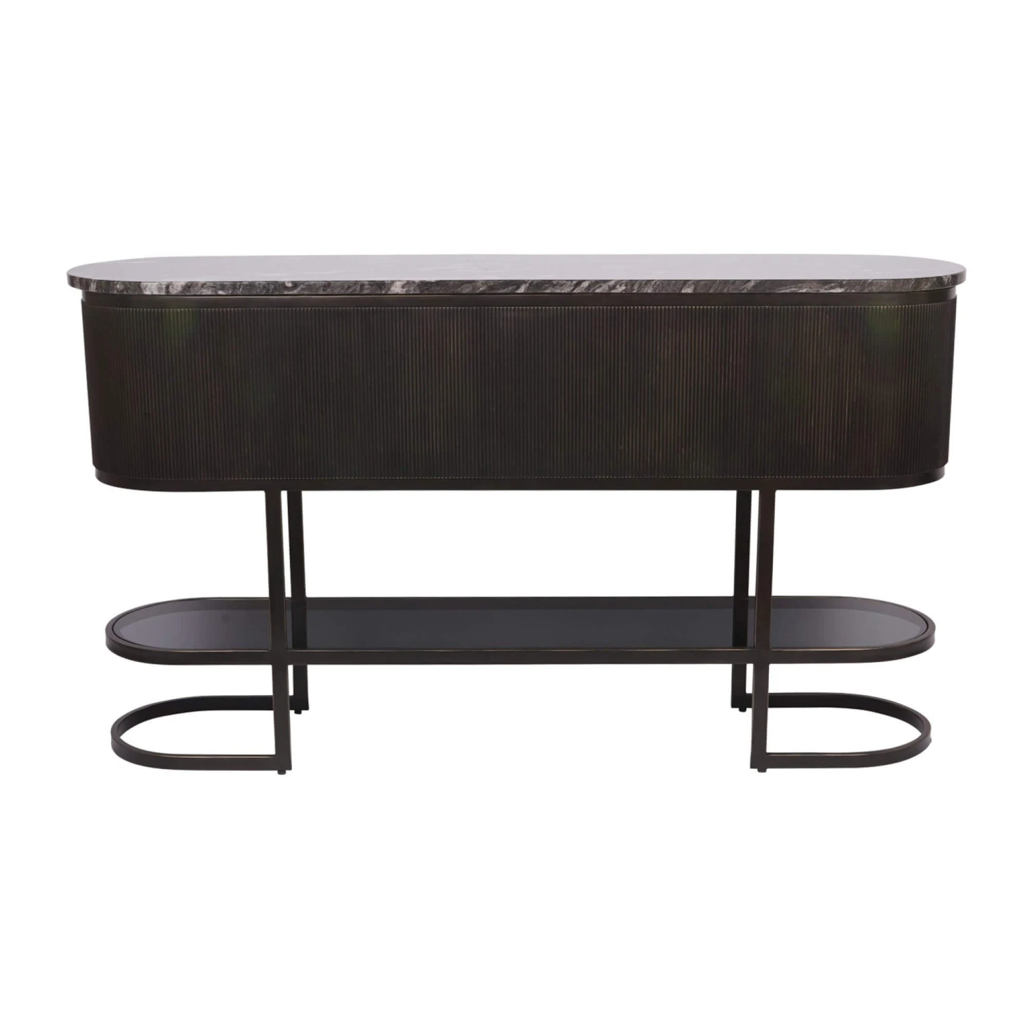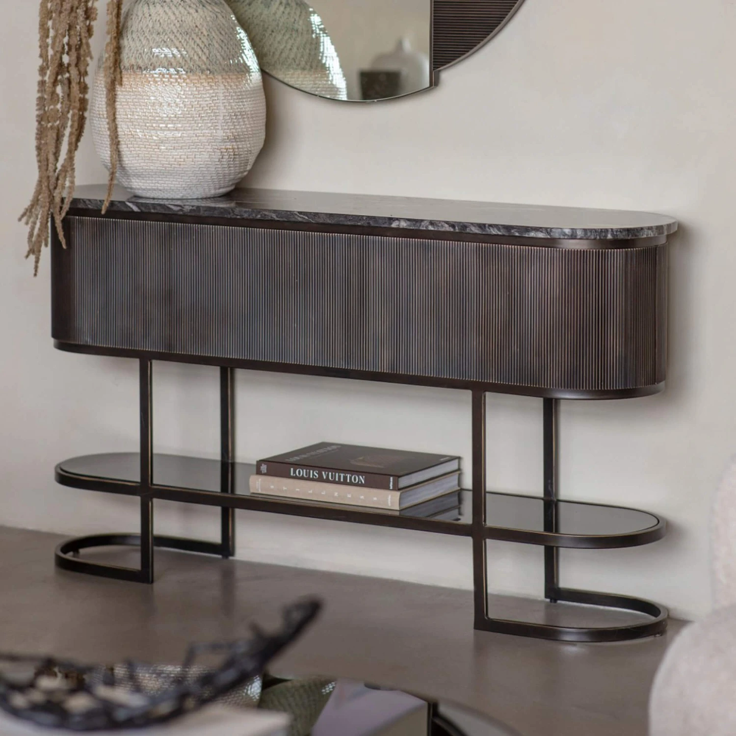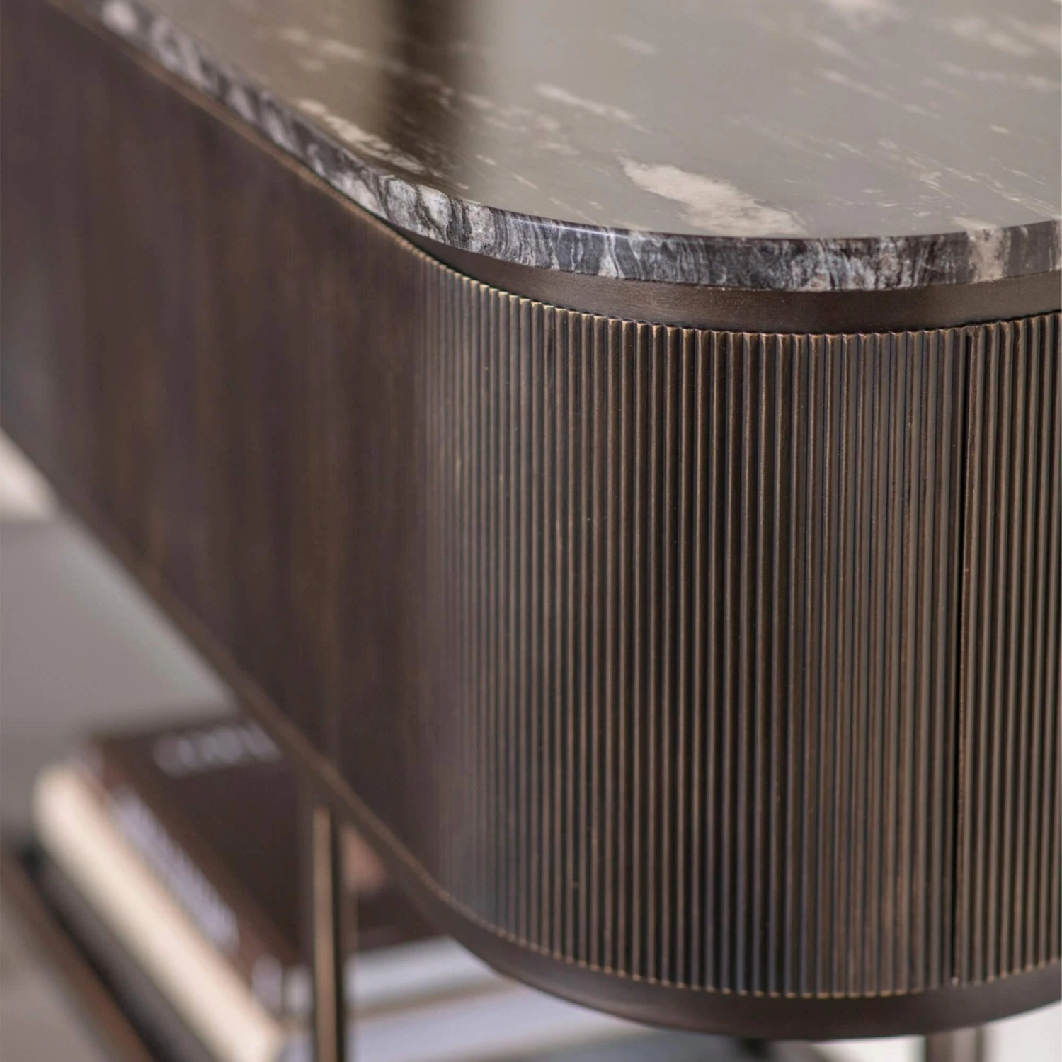 A large reeded sideboard that features a characterful marble top which rests upon the reeded base. The frames legs are made from a metal and finished in a wonderful bronze tone that compliments the rest of the unit.