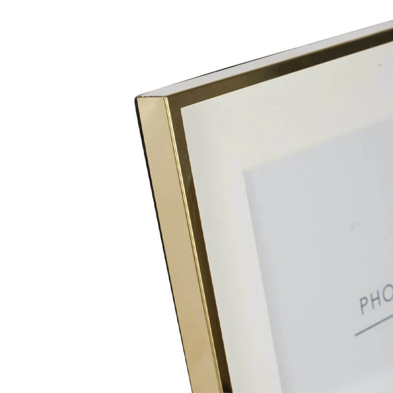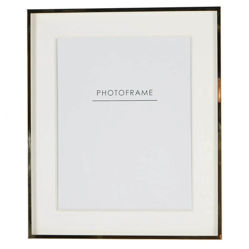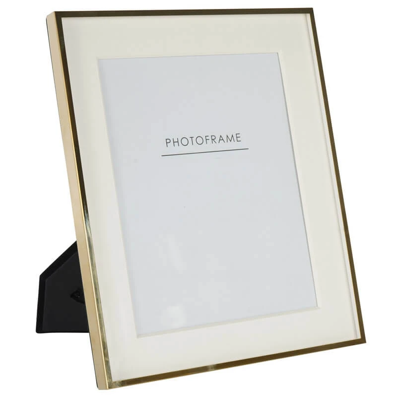 A stunning simplistic gold photo frame that features a smooth, reflective golden finish. Its bold, clean corners and streamlined design gives it a modern and sophisticated aesthetic. On the inside of the frame is the white bordered interior, which creates striking visual depth and helps draw the eye towards the photograph. The border seats neatly Infront of the image, providing a beautiful contrast to the golden frame and highlighting the contents within. This 8 x 10 inch photo frame is ideal for displaying a treasured family portrait, a scenic landscape or a special moment, ensuring your memories are presented with the style and elegance they deserve.