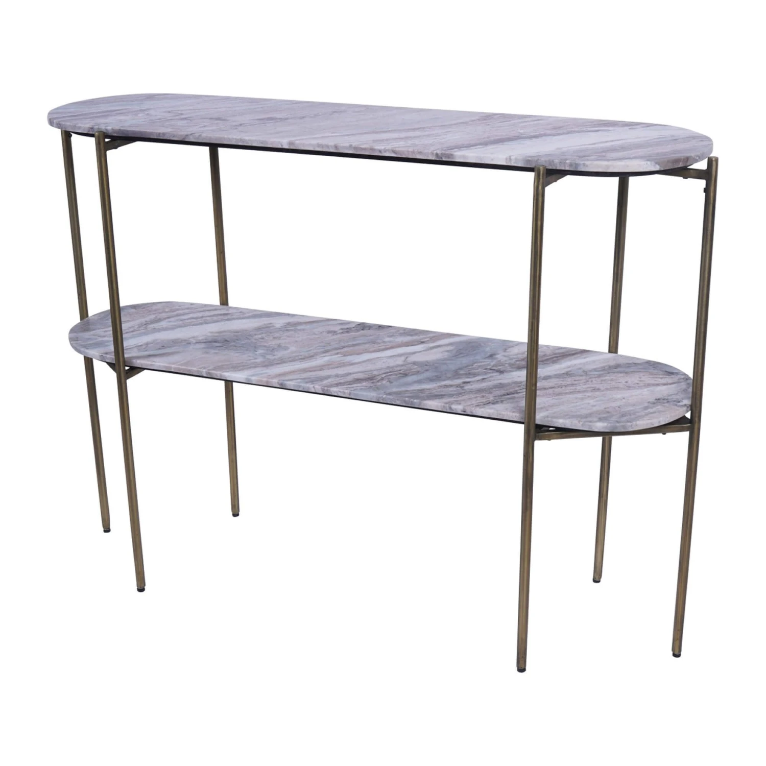 An open console table that features two marble shelves that incorporate striking blends of grey. The frame is made of slender metal bars, coated in a brass colour that contrasts the marble and creates industrial, urban appeal. Each side of the console table features a triangular frame which holds the marble shelves.