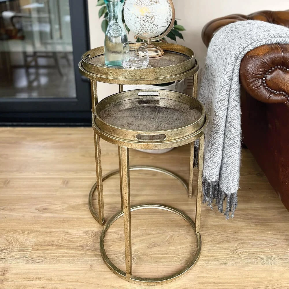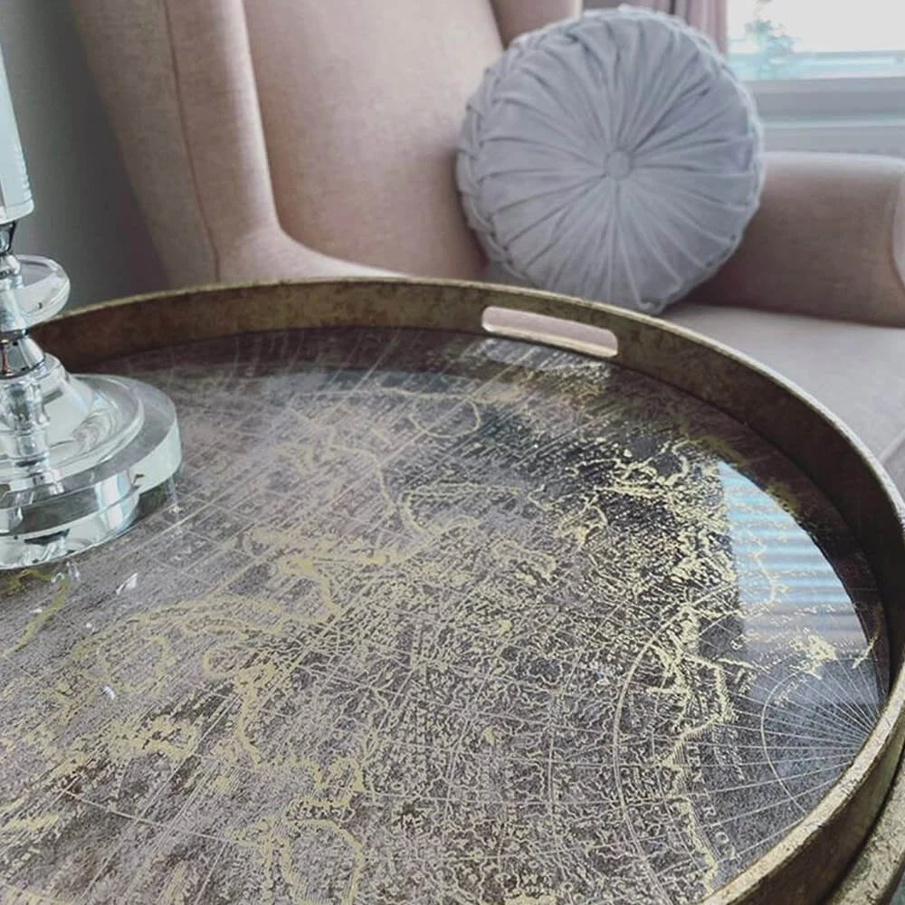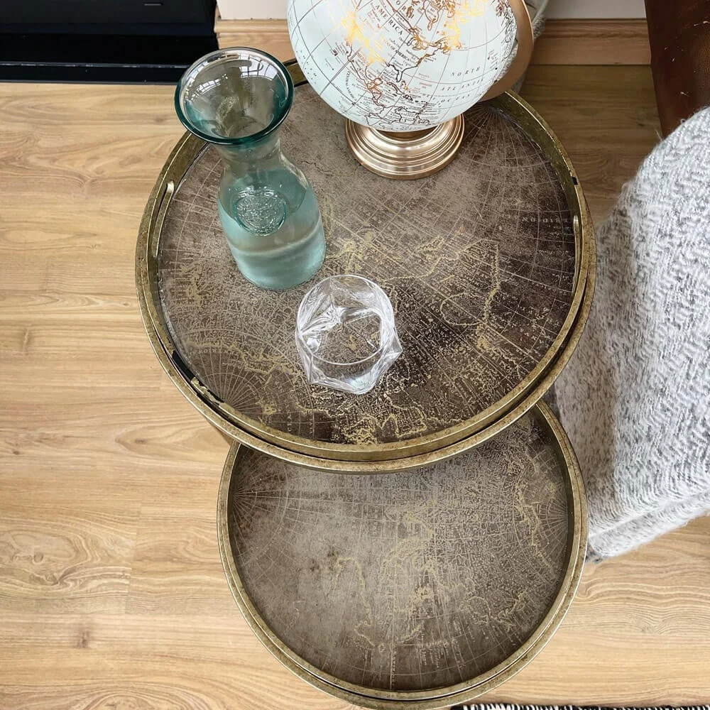 These gold nest of 2 Vienna side tables will be a chic addition to any living space. The pieces are patterned with a world atlas within the tray top which can be removed for multi functional use making it both an eye catching and useful set. Please note that due to the artisan finish there might be a variance piece to piece. Table tops have cut-outs on sides creating handles and can be lifted and used as serving trays.