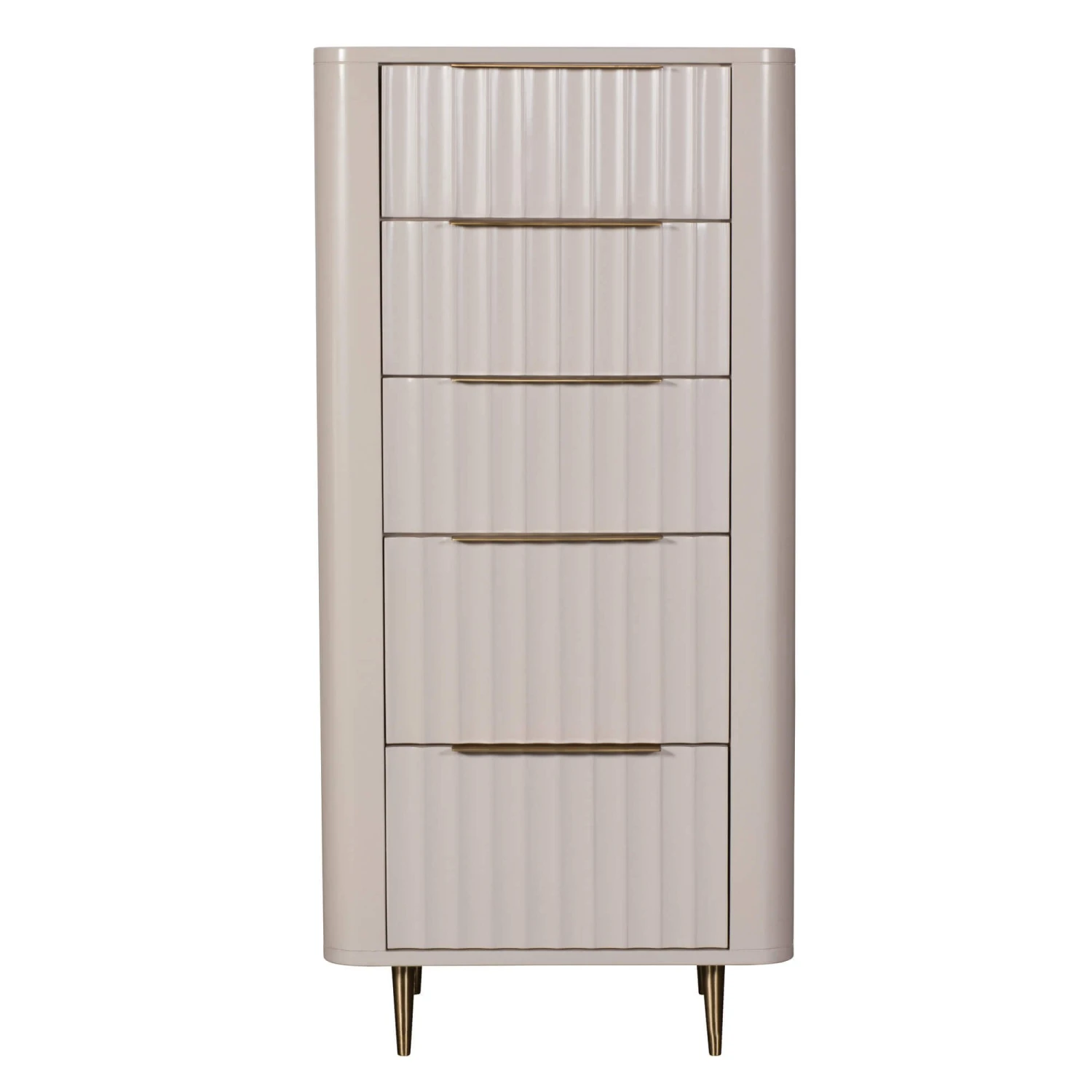 Unapologetically chic with a retro flair, the Lisette Ivory 5 Drawer Tall Chest is timeless with its mod styling and unique aesthetic. Its distinctive combination of soft, elegant curves and industrial-style corrugated fronts makes a bold stylish statement; creating a striking design that is truly individual and packed with character. Each piece in the Lisette range is hand-crafted to perfection from mahogany wood and boasts a painted finish in a soothing, ivory tone, which highlights the eye-catching, ridge-like texture of the decorative grooves. The gold accent handles and tapered legs add a lavish touch, whilst the 5 spacious drawers offer ample storage space, reflecting how every element of the Lisette Chest Of Drawers has been carefully constructed to offer both style and function; making the Lisette an impressive yet practical addition to any bedroom.
