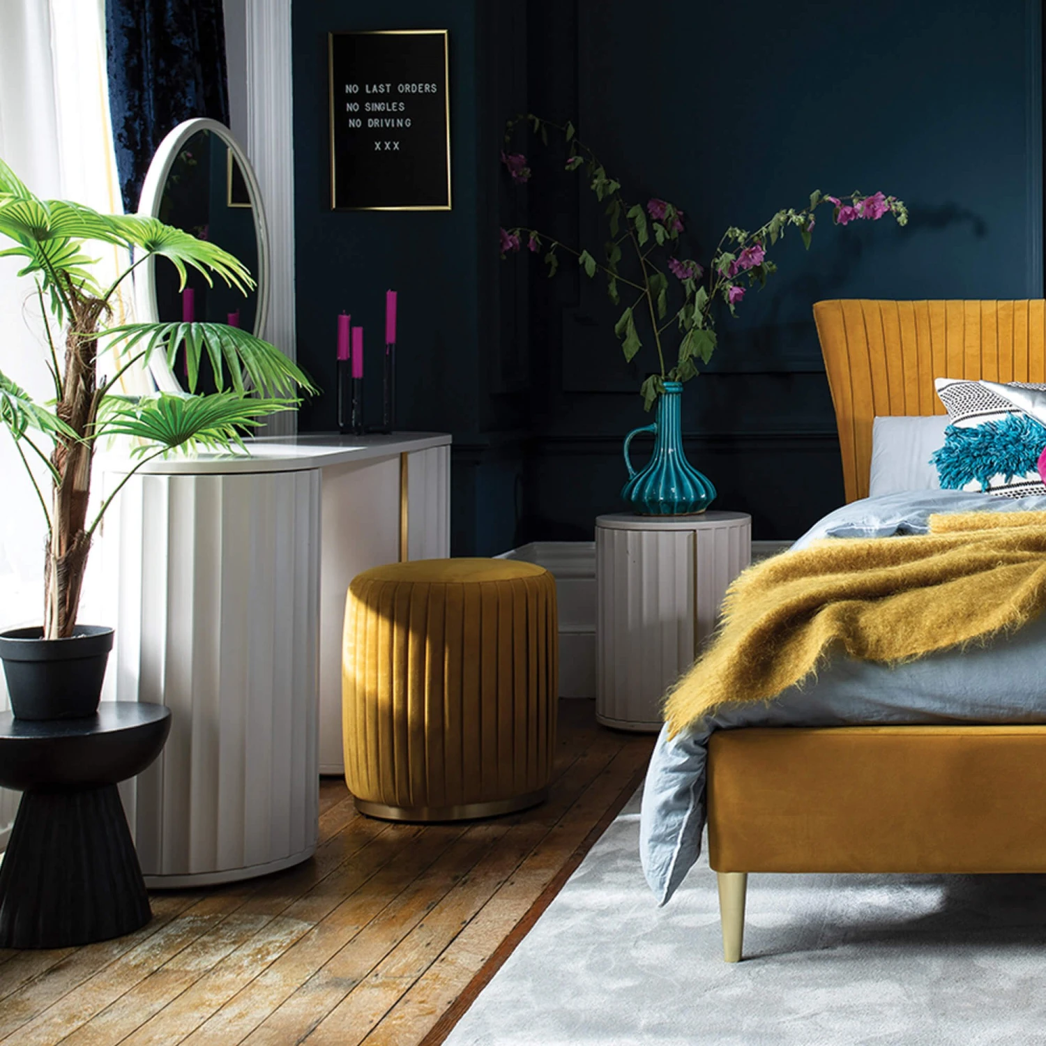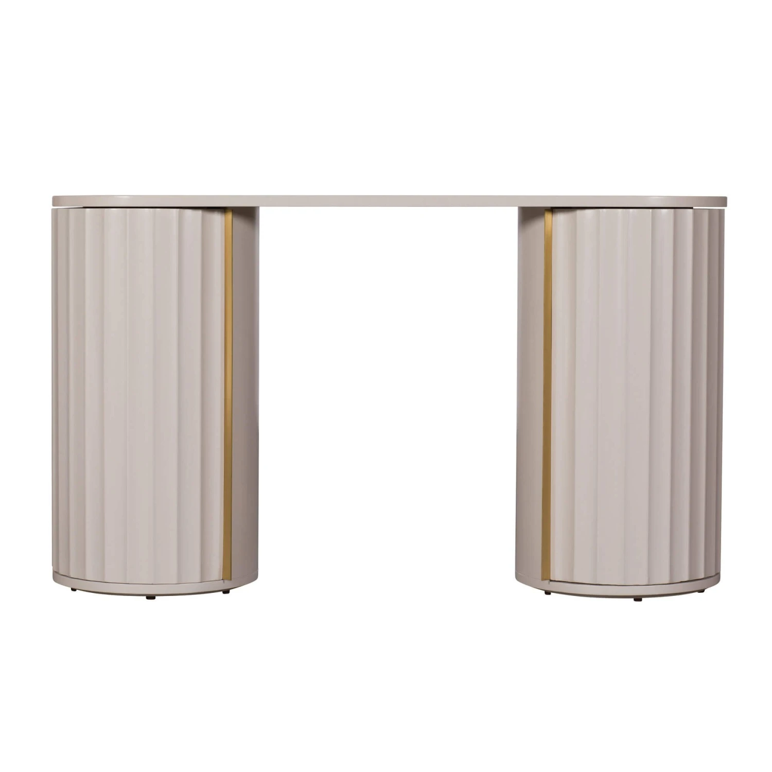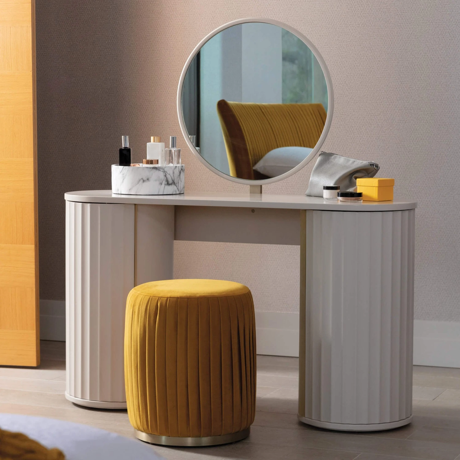 Unapologetically chic with a retro flair, the Lisette Ivory Dressing Table is timeless with its mod styling and unique aesthetic. Its distinctive combination of soft, elegant curves and industrial-style corrugated fronts makes a bold stylish statement; creating a striking design that is truly individual and packed with character. Each piece in the Lisette range is hand-crafted to perfection from mahogany wood and boasts a painted finish in a soothing, ivory tone, which highlights the eye-catching, ridge-like texture of the decorative grooves. The gold accent handles add a lavish touch and the architectural, column shaped pillars open to reveal a unique 3 tier design, reflecting how every element of the Lisette Dressing Table has been carefully constructed to offer both style and function; making the Lisette an impressive yet practical addition to any bedroom.