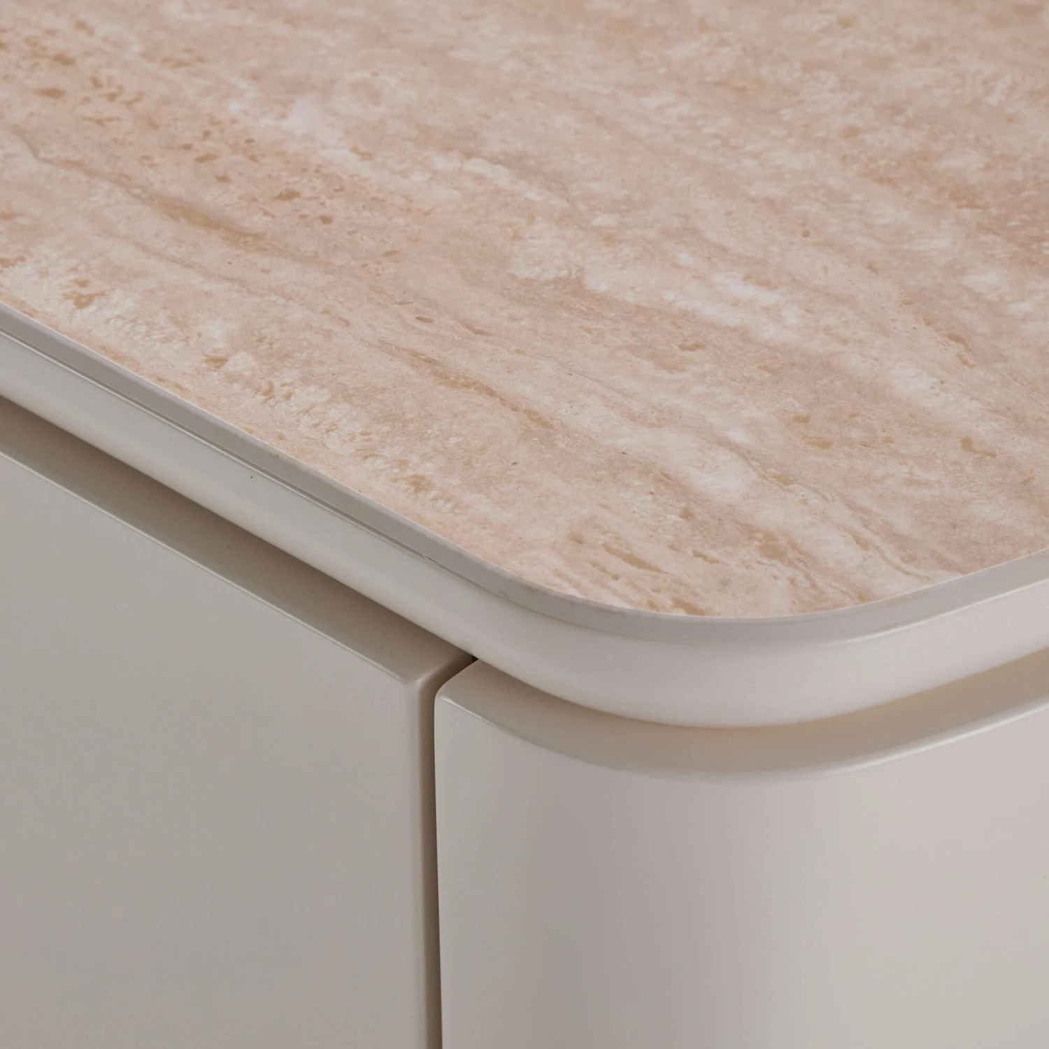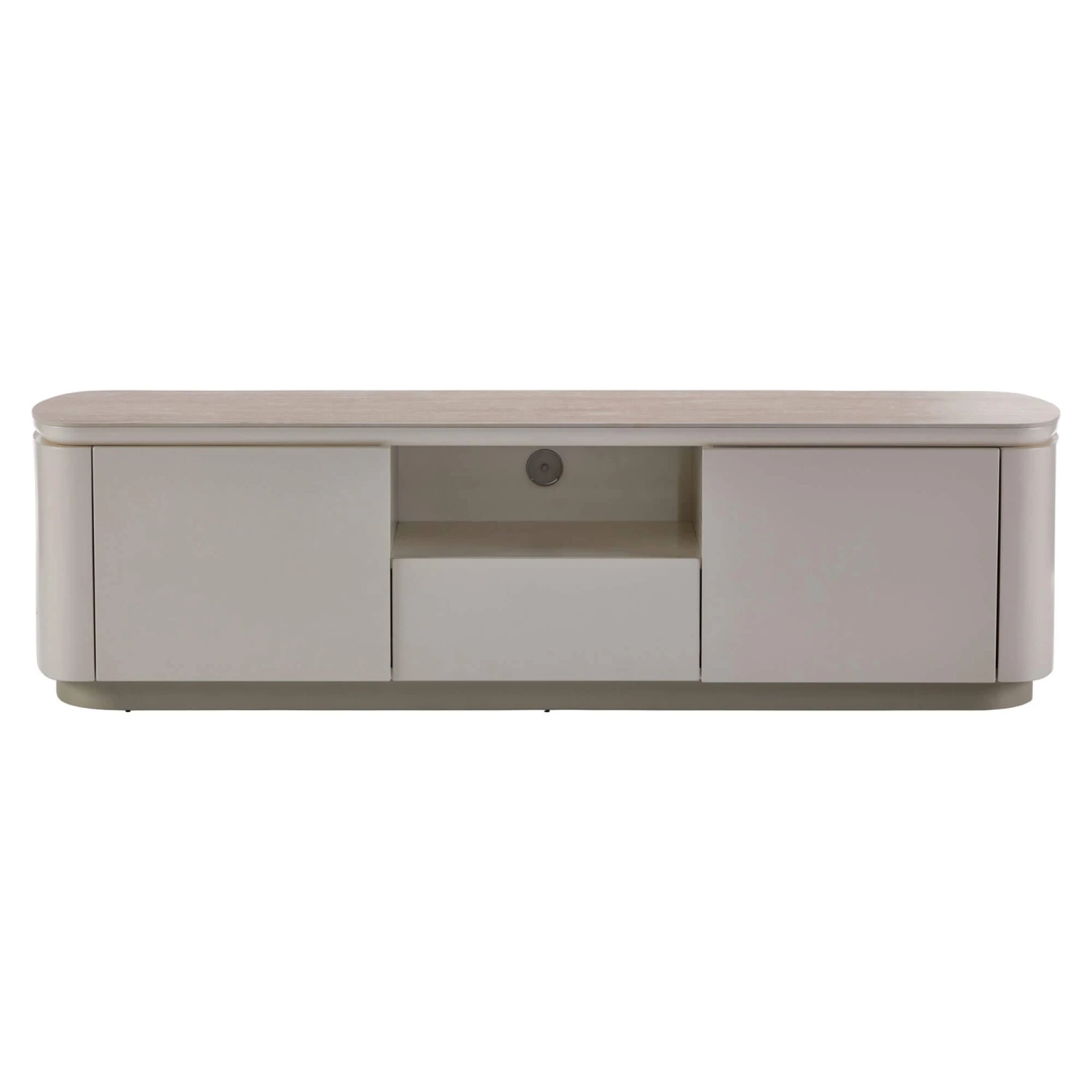 This Lorient 160cm TV Unit provides your living room with a classy, contemporary look. The top of the unit is made from a mix of MDF and travertine sintered stone to provide a very high quality and detailed finish. The body of the unit is made with MDF that is painted in a matte beige finish. This beautiful TV unit also contains two cabinets and one drawer so you can neatly store away items.