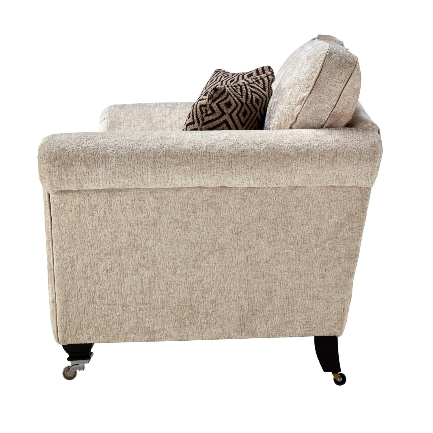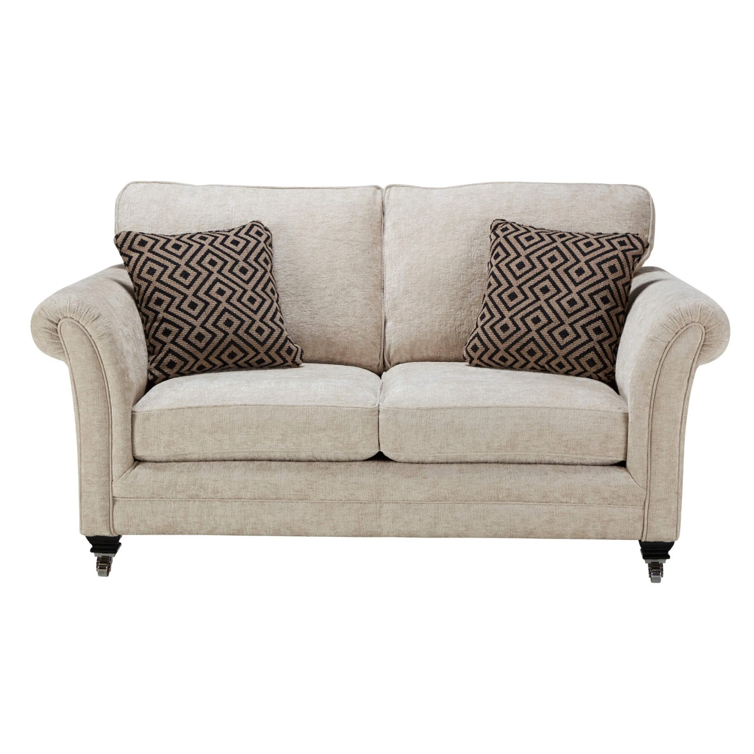 The main body of the sofa is upholstered in a natural beige chenille fabric for an elegant focal feature; whilst the two scatter cushions included are upholstered in a geometric natural and black patterned fabric, to create a dynamic design that is an extravagant visual treat to the eyes. Accompanied with its cold cure seat interior, which conforms to the shape of your body for a superiorly comfortable and supportive seating experience, the Lucinda Sofa is as indulgent as it looks and is sure to make a stylish centre-piece in any home, with its commanding presence.