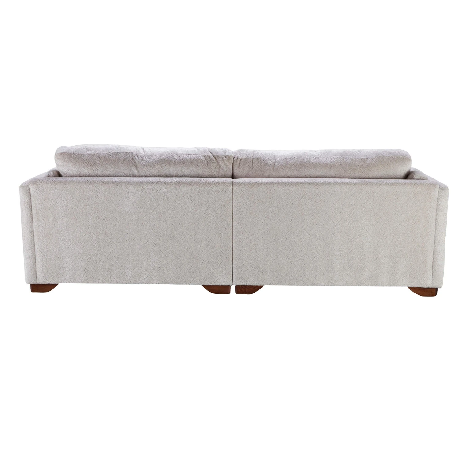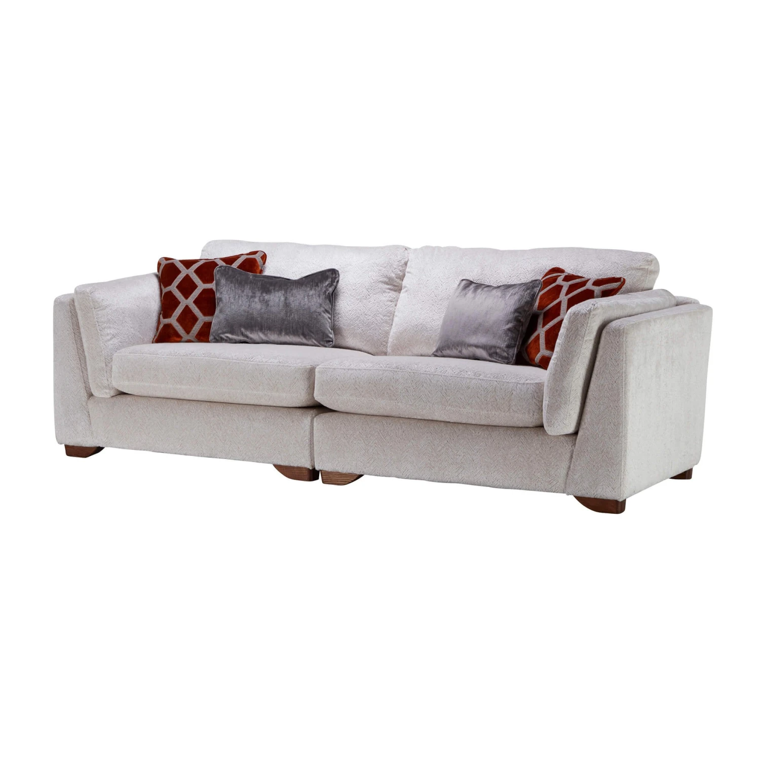 Infuse your living room with a touch of glamour and timeless style, with the Mackenzie Ivory Chevron Textured Fabric 4 Seater Sofa. This inviting sofa boasts a beautiful ivory fabric with a subtle shimmer and a captivating textured chevron effect, making it a stunning focal point for any living space. Two luxury feather-filled scatter cushions in a rich umber colourway with a geometric pattern, and two simple steel grey bolsters, perfectly complement the overall design.